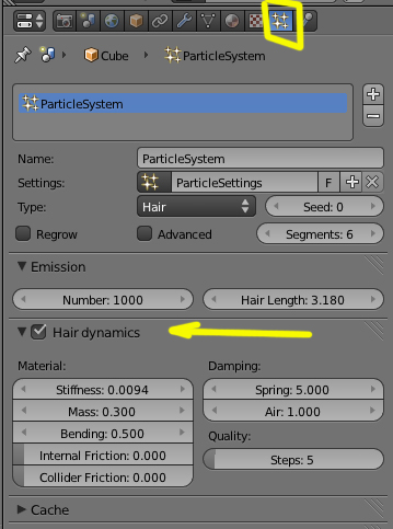 En las partículas del objeto, hay que activar primero (hair dinamics) para que el pelo sea dinámico (no estático).