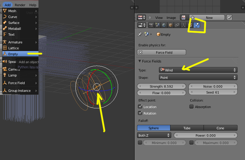 O sea, se añade primero un Empty (significa vacío), y a ese Empty se le ponen físicas (physics) de tipo force field (Wind-viento).