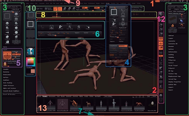 1. La ventana de ZBrush: hay elementos que no pueden separarse y trasladarse fuera de la zona ventana, pero la mayoría de ellos pueden ser altamente personalizados y se colocan a gusto en el espacio de la ventana.