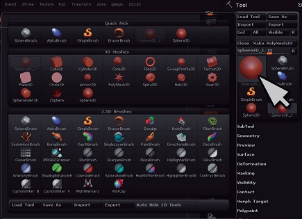 6. Ventanas emergentes: al hacer clic sobre algunos elementos de la interfaz de usuario, aparece una ventana pop-up (emergente) que contiene las correspondientes funciones relacionadas con el icono sobre el que se hizo clic. Este ejemplo muestra la ventana emergente ztool que contiene las primitivas 3d, así como herramientas 2d y 2.5d.
