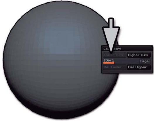3. En la paleta de herramientas que por defecto abre en el estante derecho, vaya al menú de geometría y mueva el control deslizante subdivisiones al nivel más bajo (1) o pulse el atajo de teclado shift + d dos veces.
