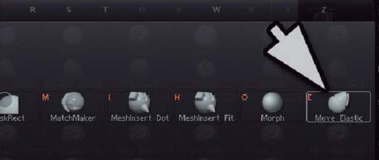 Una forma alternativa de hacer esto es el método abreviado de teclado, presionar b para abrir la ventana emergente pincel (brush), para mostrar solo cepillos que comienzan con la letra b y e para seleccionar el move elastic. Simplemente pulsar b, e para hacer este paso. Tenga en cuenta que esto funciona con todos los cepillos de ZBrush, sólo tiene que aprender los atajos principales favoritos para alzar su productividad.