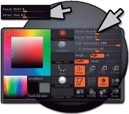 10. El estante superior (top shelf) contiene los atajos a los principales ajustes de pincel y manipulaciones de ztool. Esta área incluye todos los elementos que se necesitan en forma regular para trabajar en el modelo o la pintura: el modo de edición, mover, escalar y las funciones de rotación, el zadd o zsub modos, el tamaño y la dureza del pincel (draw tamaño y Focal turno), z intensidad, el acceso a las más importantes utilidades (proyección maestro, caja de luz, quicksketch) y mucho más.