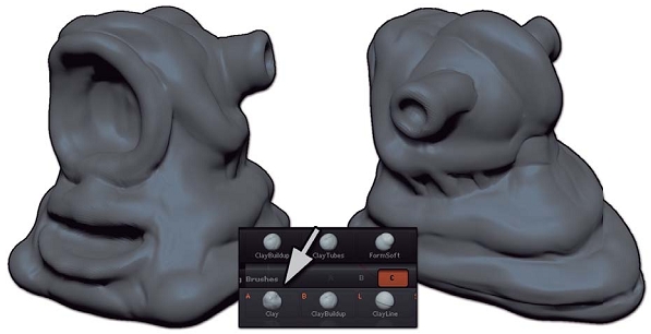 9. Ir al selector de pincel en el estante izquierdo, haga clic en el para abrir el menú emergente y elegir Clay buildup brush o simplemente pulsar b, c, b para hacer este paso.