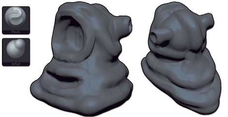 11. Puede seguir esculpiendo con el cepillo de arcilla, pero también puedes probar otros cepillos como inflar (b, y, n) para ampliar las áreas o sujetador (b, h) para sacar puntos para el trazo de pincel. A medida que use ZBrush más y más, usted descubrirá que todas sus necesidades creativas pueden cumplirse a través de los pinceles prestablecidos y numerosos ajustes.