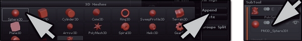 Ir al menú de herramientas>> subtool y por debajo, cerca de lo vacío, la lista subtool, haga clic en el botón añadir (appennd). Una ventana emergente de la paleta de herramientas aparecerá, mostrando los objetos cargados en 3d y primitivas. Haga clic en la primitiva sphere3d. Como te darás cuenta, ZBrush le advertira de qué se trata de una primitiva (un objeto paramétrico) y debe convertirse en un 3d polymesh si desea agregarlo como subtool y esculpir en ella. Pulse sí.