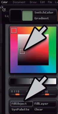 Luego, en la paleta color, haga clic en el botón fill objet. Esto llenara todos los polígonos de su modelo con su color base seleccionado.