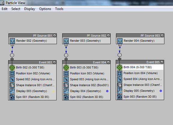 Ya lo pude resolver, es con el modificador spin del particles view, igualmente ahora me surgió otra duda, es posible hacer que los tres Particle Flow source interactúen entre sí? Por ejemplo, que las partículas entren en un box.