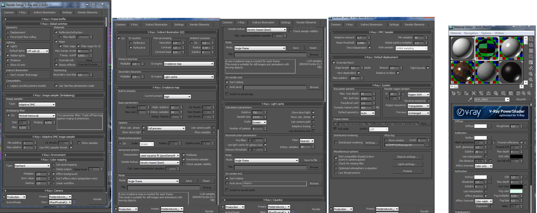 Os adjunto la primera prueba, y la segunda. Además, del render setup y también la configuración del vidrio. Muchas gracias.