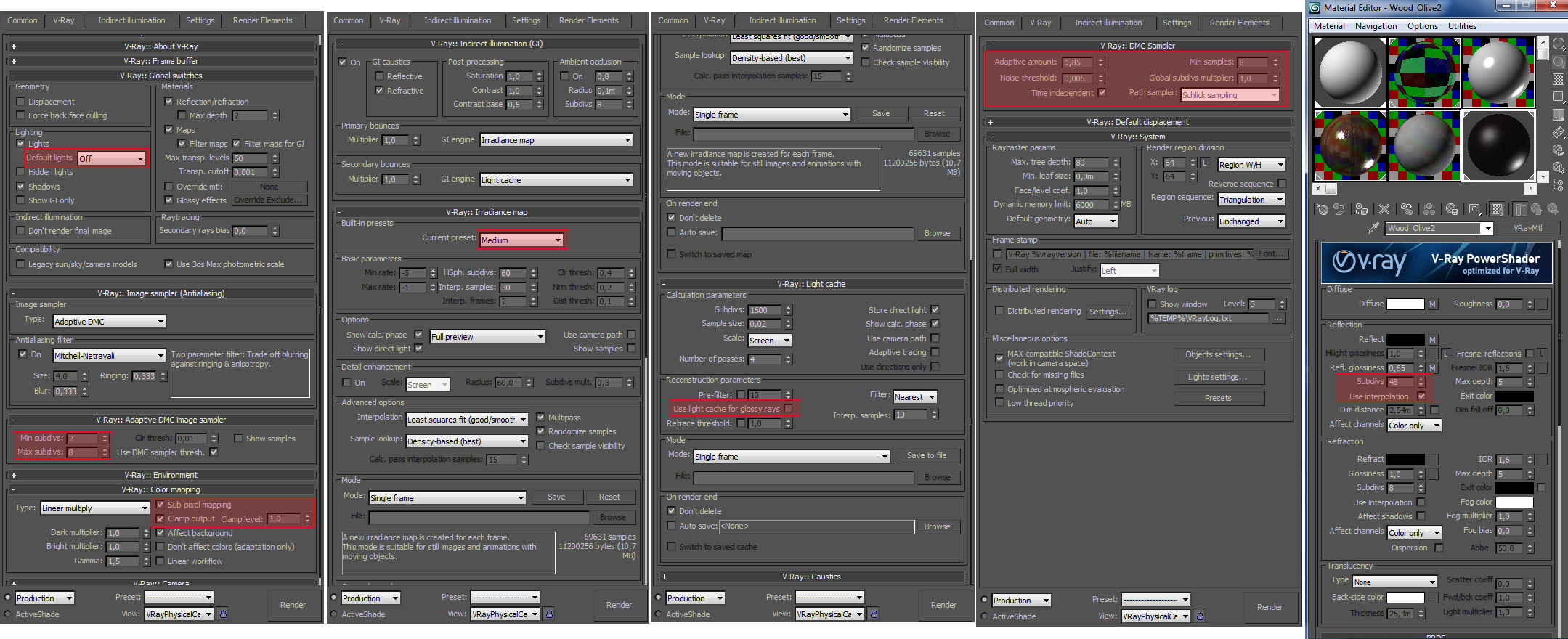 El Irradiance Map, lo sigues teniendo en high, y no hace falta a mi entender, con medium como preset más es suficiente para una escena como la tuya. Las subdivisiones, de las vraylights, a 600, me parece una salvajada, aumentaras los tiempos de render una barbaridad para algo que no es necesario, sube a 200 subdivisiones, solo aquellas que te generan manchado, o veas tu que tocando este parámetro limpias algo la escena, controlando el tiempo de render, esto ya ves que depende siempre de la escena, no suelo tener valores fijos.