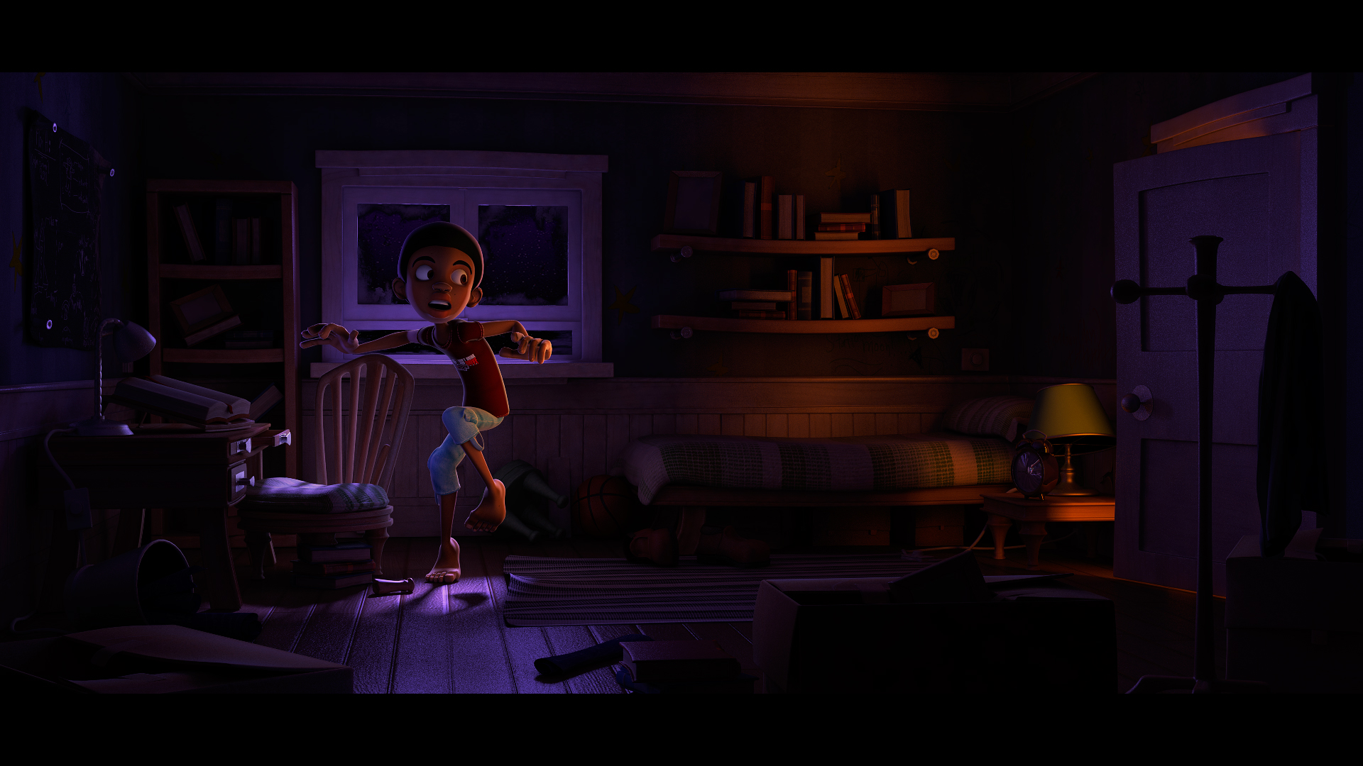 Por el contrario, bajar un poco el contraste entre la zona iluminada del personaje y su sombra, suavizándolo un poco. Bajaría un poco la potencia de la zona iluminada ya que lo veo un poco sobreiluminado contando que la luz del pasillo no le da directamente. Por supuesto va a estar más iluminada como muy bien has hecho, pero a mi parecer no tanto, parece que la luz le está dando de lleno, sin embargo, la luz solo da directamente a esa parte del suelo, cama y pared con los libros que muy bien has iluminado.