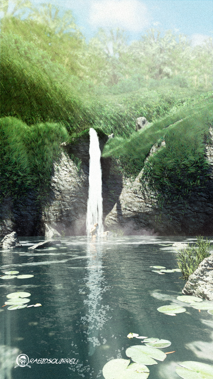 Después de enfrentarla a dromeosaurios, carnotauros, Anubis y darle la soul reaver, por lo menos le debo un baño ¿no? Esta vez quise experimentar terreno desconociso con el Hair and Fur para el pasto en algunas tomas. El agua es de Particle Illusion, aún no toco el Particle Flow, pero ya viene. Saludos.