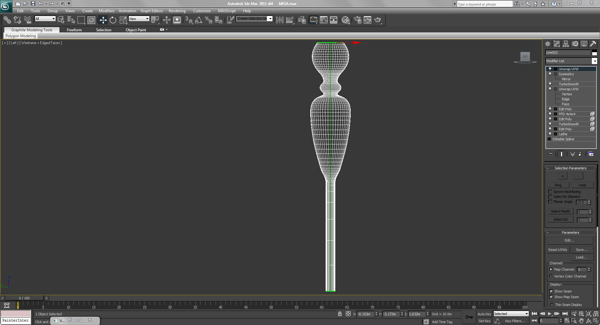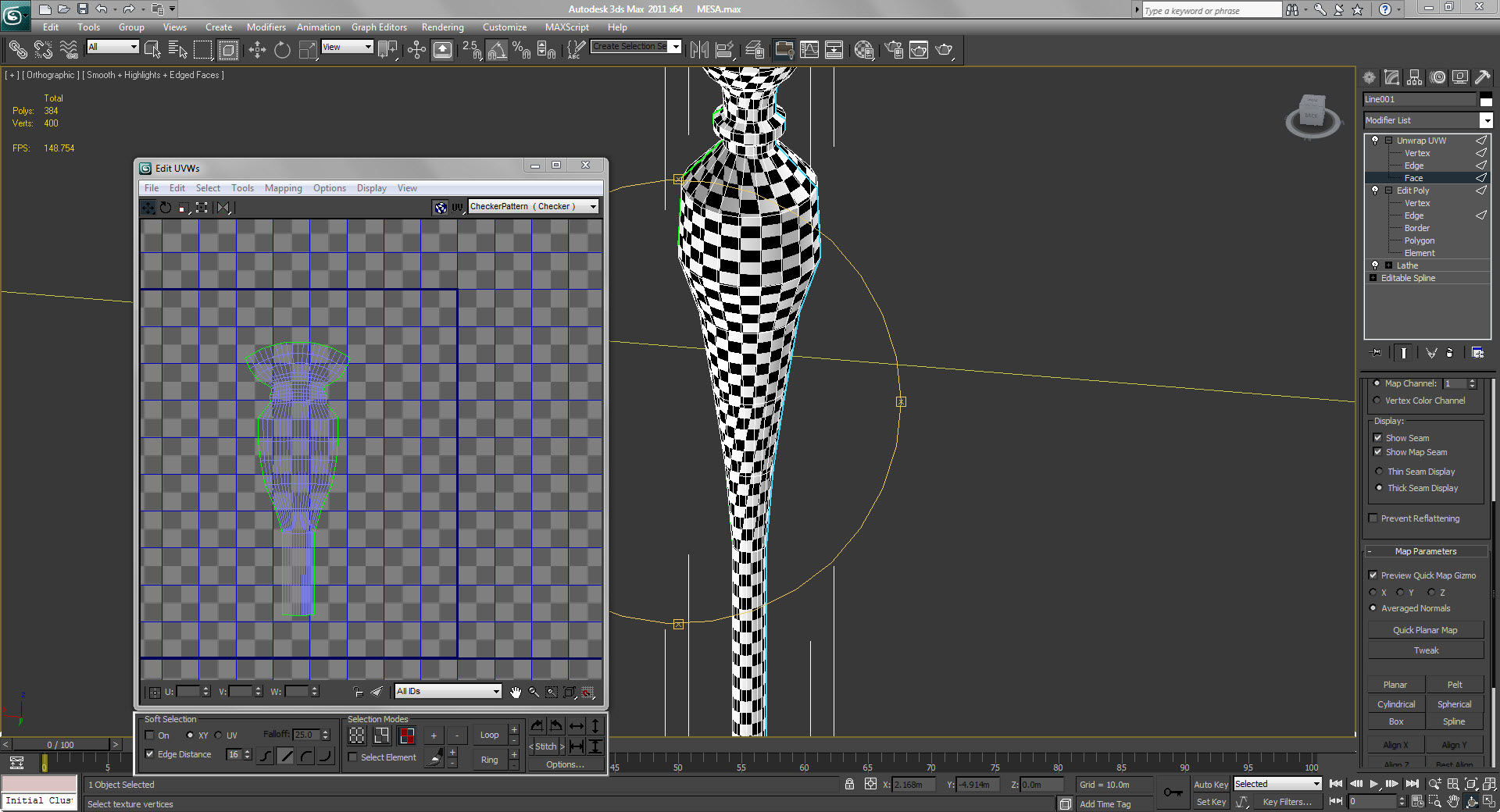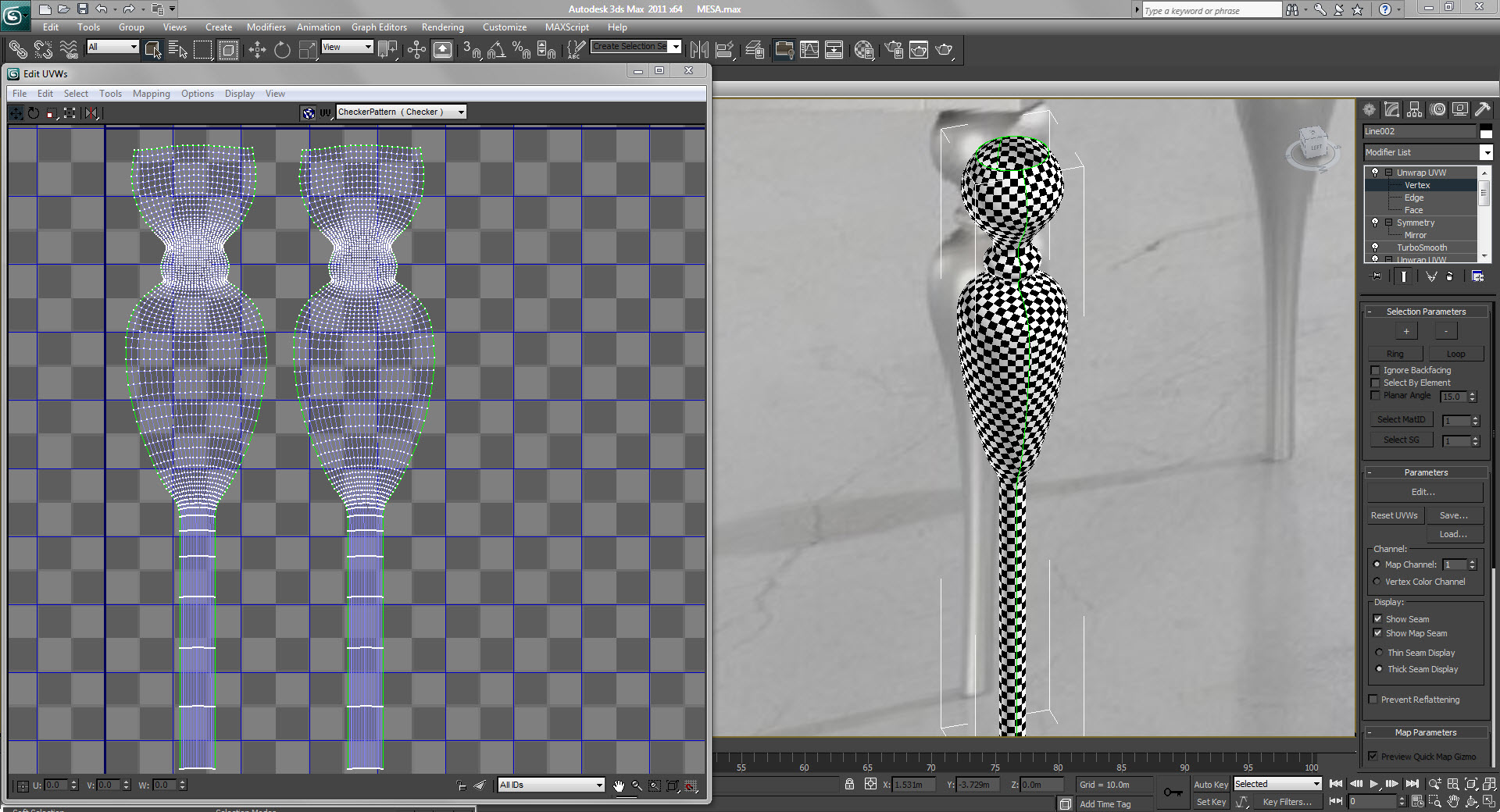 En la imagen dejo el historial de modificadores que use para modelar la pata de la mesa (se que para muchos esto es sencillo a mi se me dificulta :$), también dejo mi Unwrap aún que el material de la referencia es aluminio quisiera dejar preparado mi modelo para cambiarle el material a madera, use Pelt y vaya que me cuesta manejarlo.