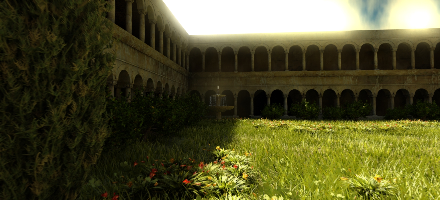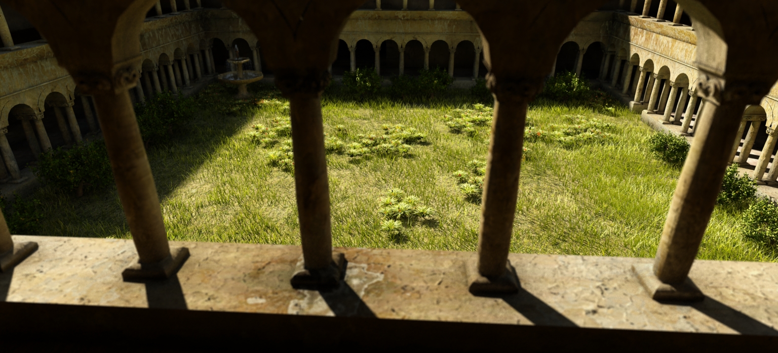 Las plantas son proxies de Vray, contando con altísimo número de polígonos. Los pinos (cypress) posen 50 millones de polígonos cada uno, y más o menos en ese conteo están todas las plantas. El césped fue hecho con Shag:Hair (el modelado) y convertido a geometría y luego a proxy. Son cuadrados de césped que se pueden poner forrando el suelo y si se superponen más cuadrados de césped, el mismo es más denso.