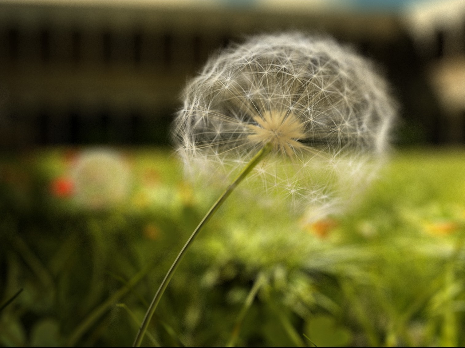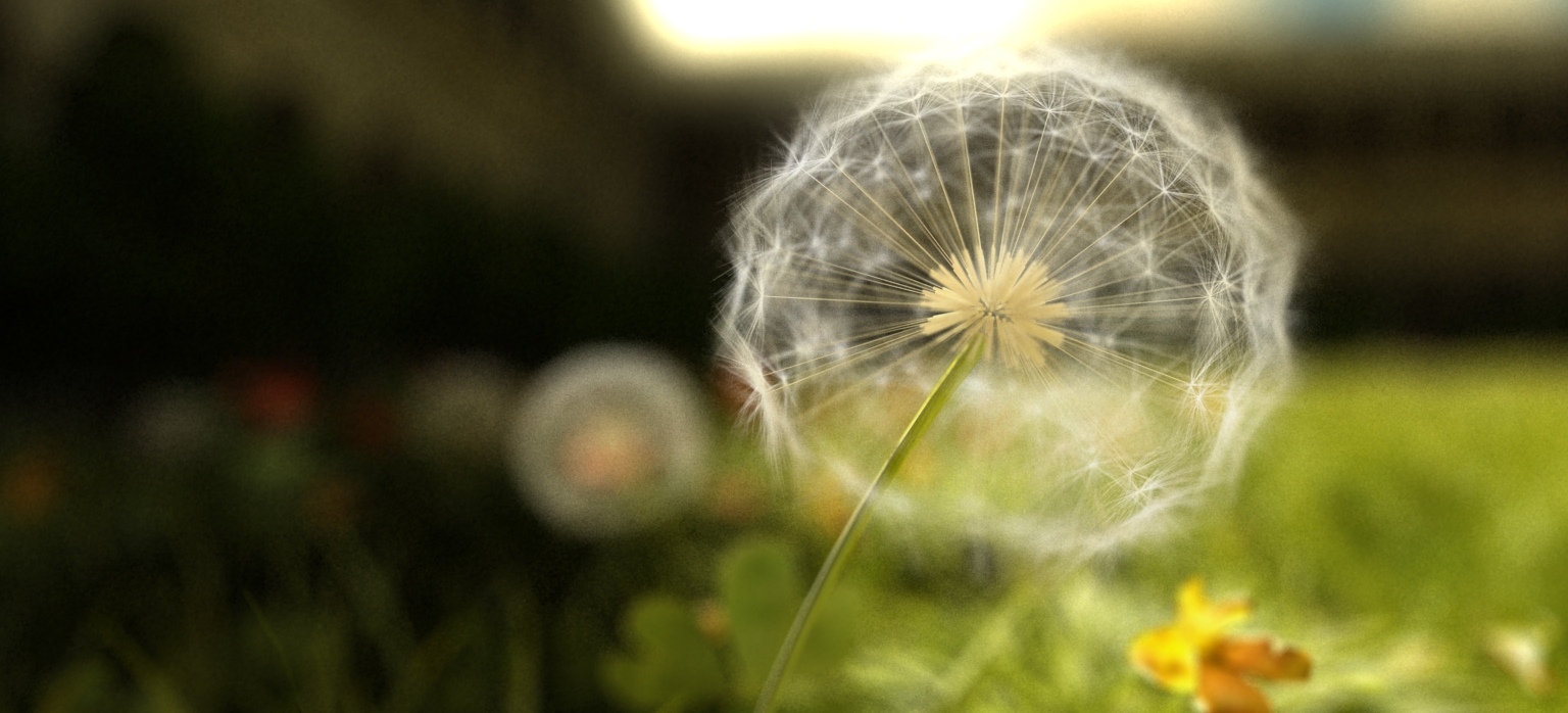 La flor de diente de león es toda geometría, modelada con la ayuda de noise para deformar la precisión matemática de scatter. Los pelos son conos segmentados en 6 secciones para poder añadirle curvatura.
