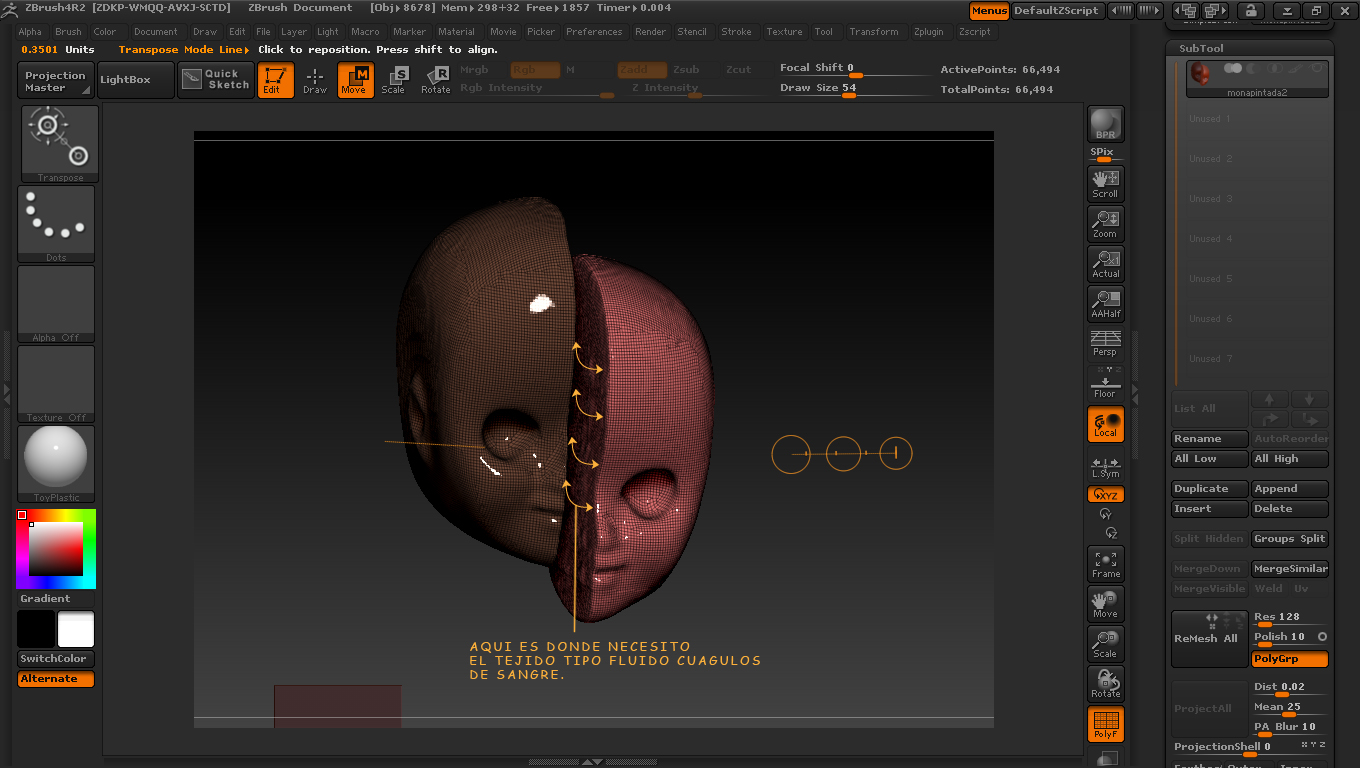 Hola estoy modelando una cabeza de muñeca, en ZBrush, para una escena donde quiero que la cabeza se parta en 2 y se vaya separando poco a poco y ente las 2 mitades se vea un tejido tipo coagulos de sangre, ya saben como el clásico efecto de películas de terror, en el que le parten la cabeza a alguien y se va desprendiendo, no sé bien cuál será la mejor forma de lograrlo, bueno de hecho, no sé cómo, quizá por tratarse de un fluido podría usar remallo, pero en caso de que fuera así no sabría como pues se muy poco de remallo ¿podrían aconsejarme? Gracias.