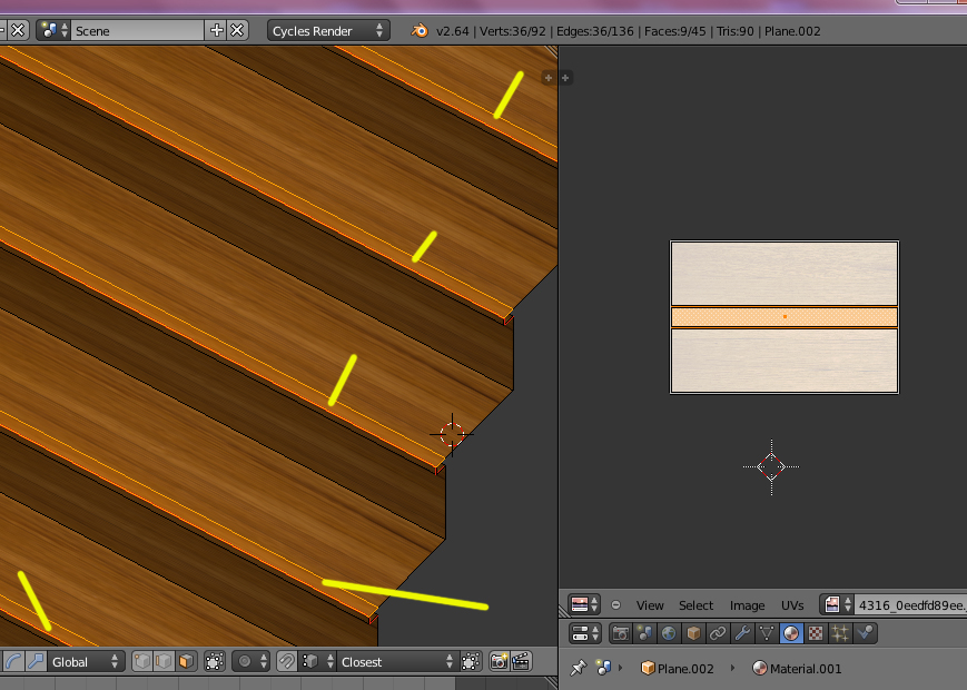 Lo primero que haría es quitar el loop que te sobra para así dejar el escalón completamente plano (una cara), como veo que utilizas Cycles, veo que te falta poner el nodo de texturas coordenadas en UV.