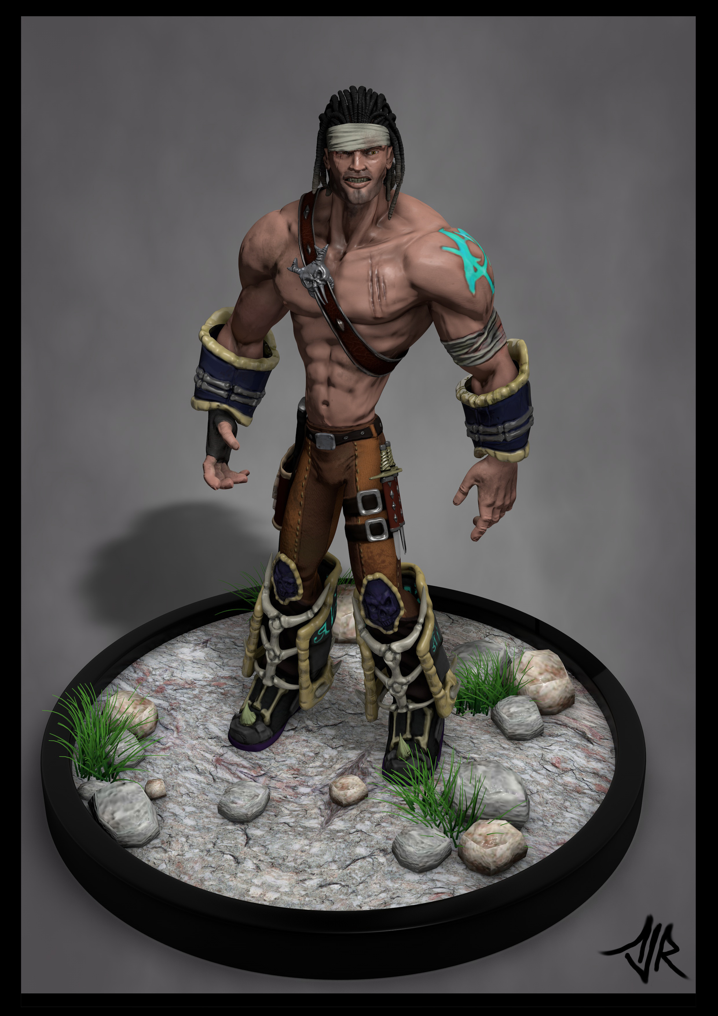 Una vez termiando el rigging ya sólo queda colocar el personaje en una postura chula, y colocarlo en una escena con una iluminación a su medida, y. Render.