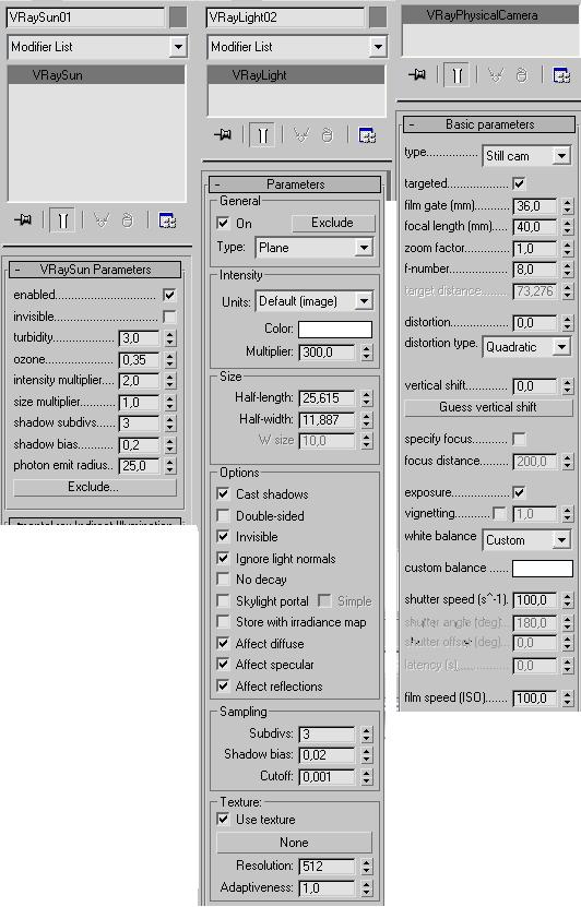 He puesto tres luces: un Vray Sun y dos vlight planas en el ventanal de la fachada y la derecha.