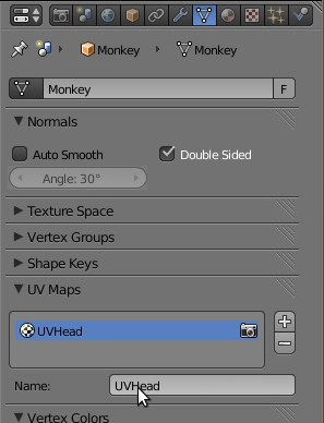 Después de que hallas creado las costuras necesitas guardarla en una de las ranura de tu Mesh para eso vamos a la ficha UV texture en la ventana de propiedades de la Mesh, puedes añadir más mapeados UV, pero mantengamos las cosas simples por el momento. Simplemente haz clic en el símbolo + y añádele un nombre.