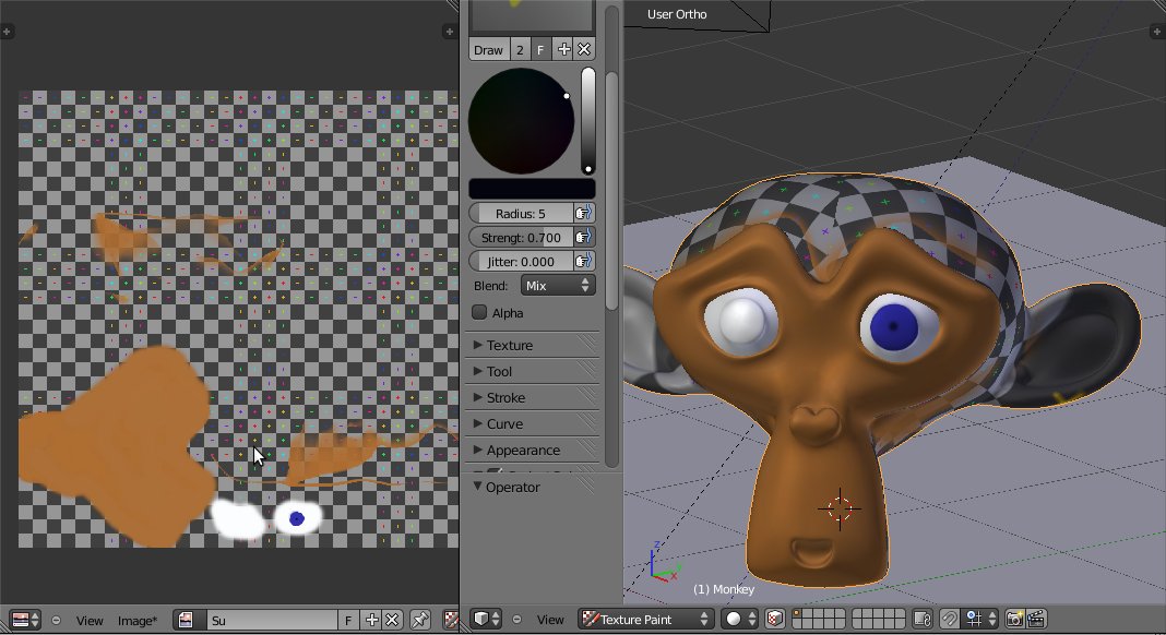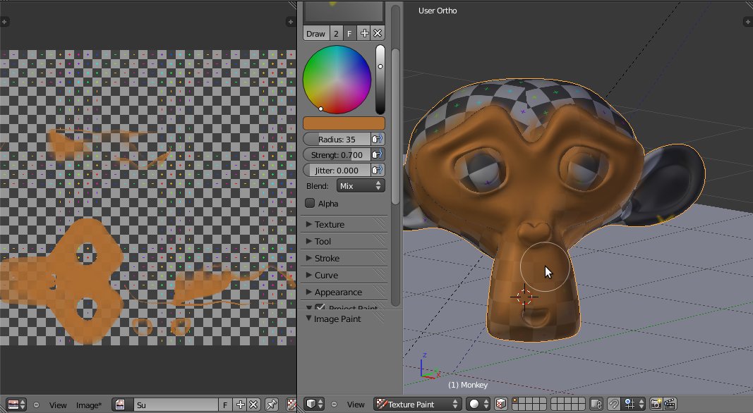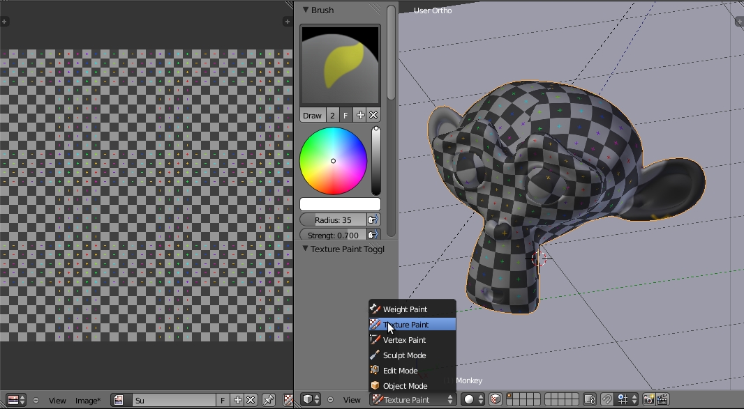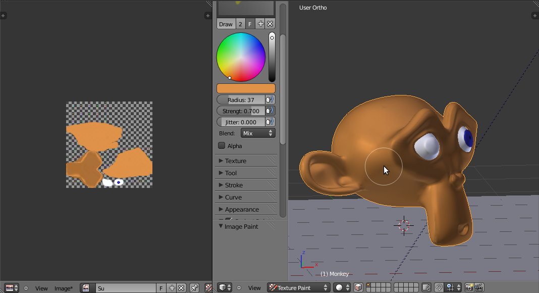 Luego de crear nuestra imagen podemos empezar a pintarla, vamos al menú desplegable de la vista 3d, y seleccionamos Texture Paint, en ese modo podrás pintar el modelo para darle un color base, con varias herramientas que se despliegan pulsando la + que está en el borde superior izquierdo o pulsando la tecla t. No voy a entrar en detalles, pero desde aquí puedes usar muchas herramientas de alto nivel, que te permiten elegir el color, los tipos de pinceles para usar, efectos como Jitter, el radio del pincel el modo, he infinitas herramientas más de uso más especificas.
