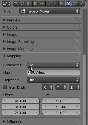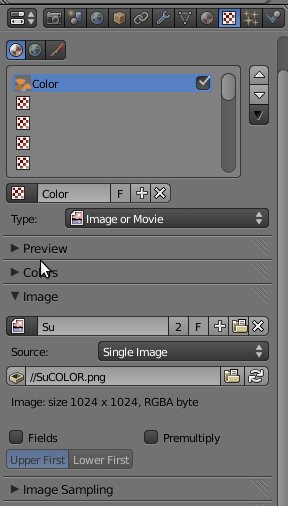 Luego vamos a properties >> texture >> new y añadimos una textura y la llamamos sucolor o cómo se te ocurra, volviendo al tema en el type elegimos image or movie y en la ficha image abrimos la imagen que preparamos en el UV. En la ficha mapping establecemos que coordinates vienen del UV y el map del UV que definimos anteriormente.