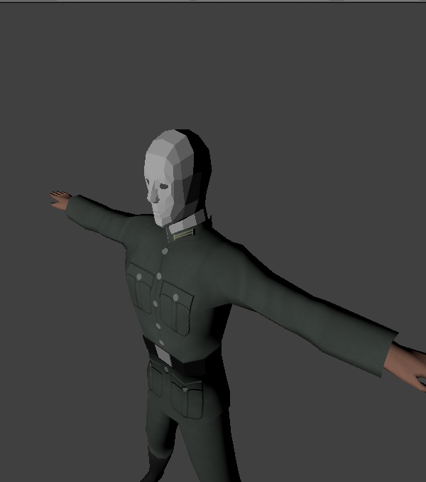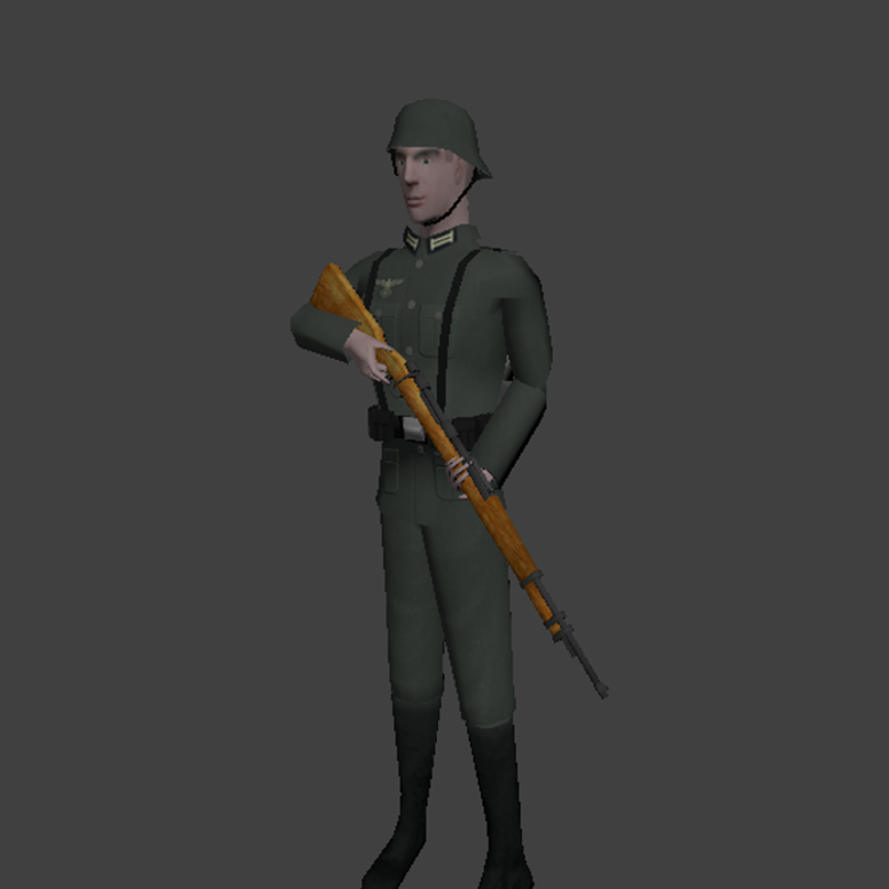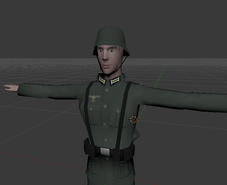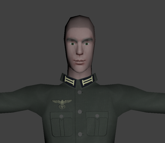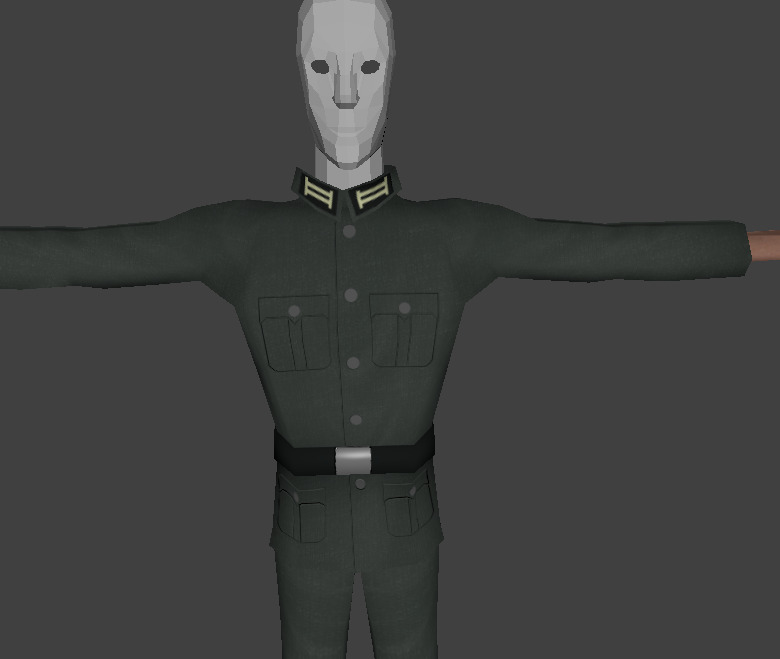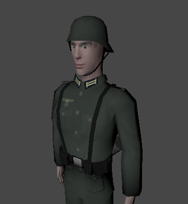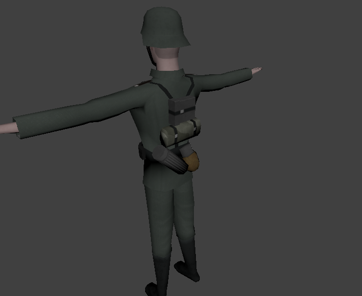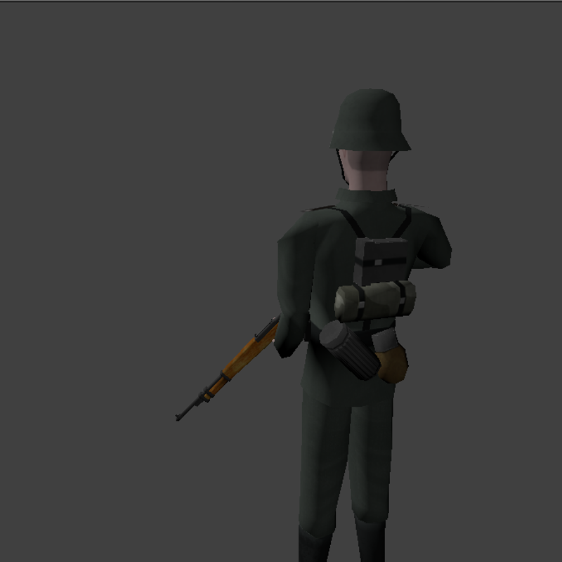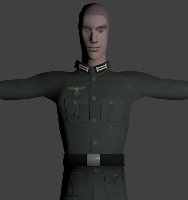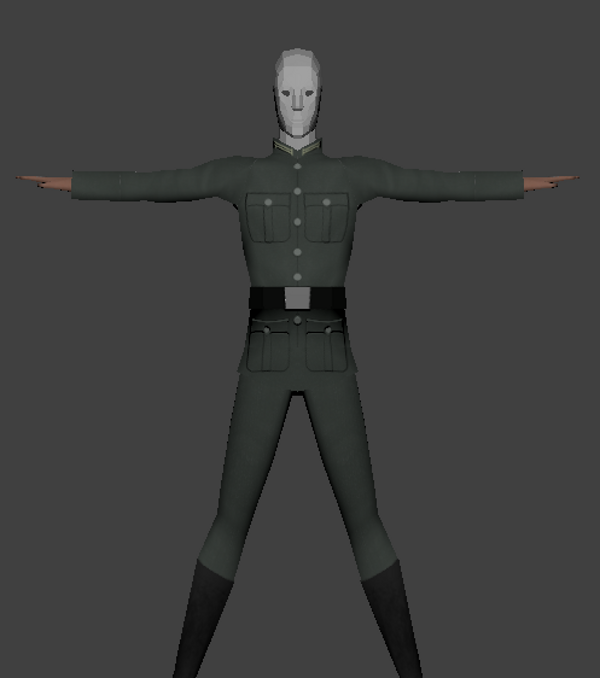 Buenas. Estoy realizando un modelo low poly de un soldado alemán de la segundad guerra mundial. La parte de modelado ya está prácticamente acabada, y con un buen resultado a mi parecer: 740 caras y 740 vértices. El caso es que, ahora estoy por la parte de texturizado y la verdad es que nunca ha sido mi fuerte. Las texturas que hay ahora son de prueba, y bueno espero vuestra sugerencias para mejorar el resultado iré actualizando según avance.