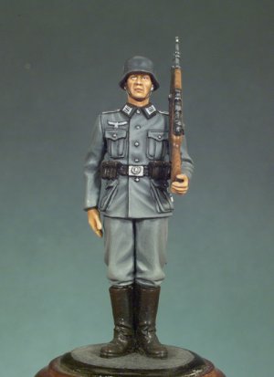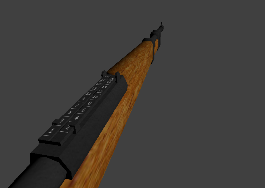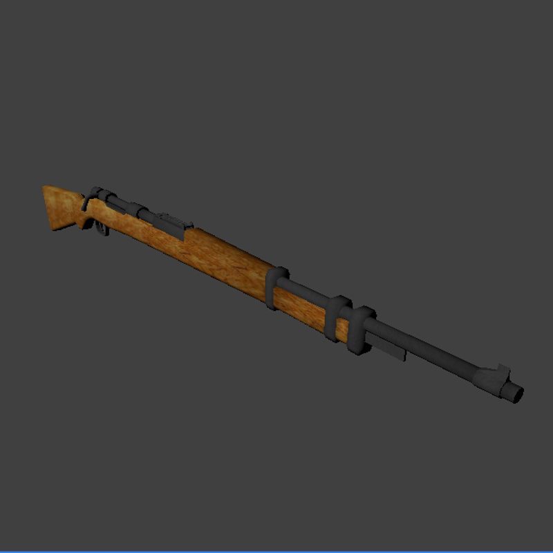 Ya le he puesto las primeras texturas al máuser, la verdad es que no luce mal, pero tengo que mejorarlas. En conjunto con el soldado y casi todo su equipamiento son 1584 caras, más o menos el máximo previsto.