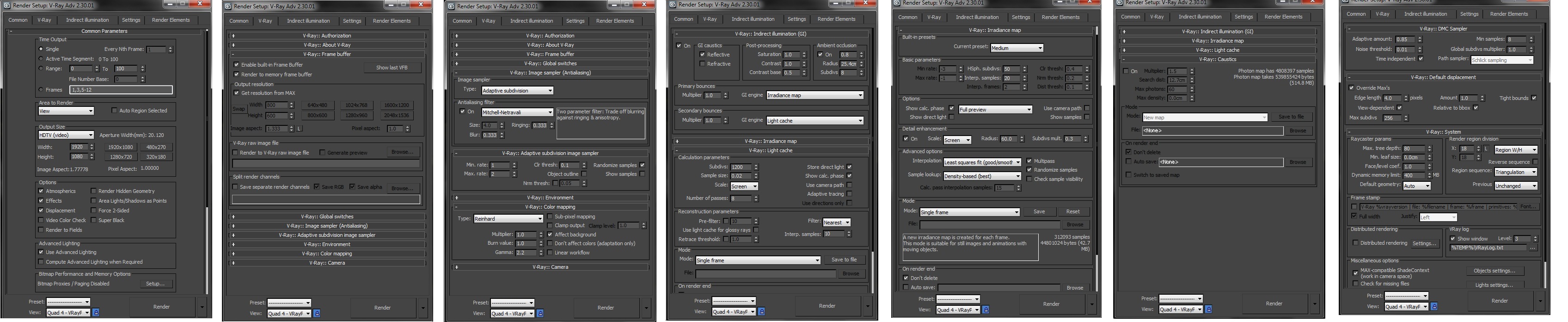 Debes desactivar GI Caustics, reflect. Noise threshold en 0,002. En Light Caché desactivat, estore Direct Light. En global subdivisiones en 3 para que tus materiales, luces, Occlusion, tengan mayor calidad.
