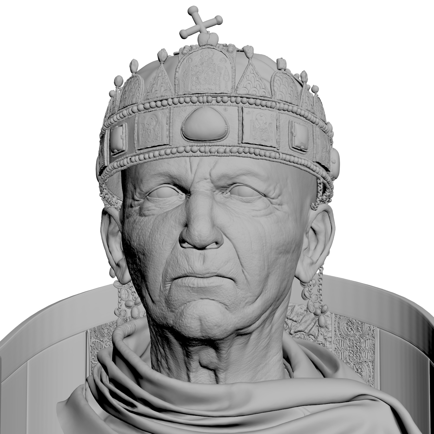 Hola, es un trabajo increíble, destaco todo el esculpido de muchos detalles, de la corona y del detalle del relieve de la piel. En contra el render final tiene una profundidad de campo sumamente extraña, el fondo no está todo lo borroso que debería estar para destacar el primer plano del rostro, y el cabello tiene un efecto de blur, que no término de encajar, la piel y los ojos, creo que si has esculpido y texturizado a este nivel, te quedaría trabajar estos un poco más (vamos sé que no es fácil) pero estoy seguro que lograras mejor acabado si les das un poco más de vueltas, ahora les veo falto de brillo especular. Vaya, la toga que lleva en el render final, ¿es una imagen 2d pegada? No corresponde según veo a la que tiene tu modelo ZBrush.