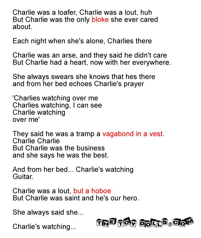Hola de nuevo. Tatay, lo de las orejas lo sé, pero es que, si las attachohe de hacer lo propio con los target. Al grano, hoy animando a ratios cada día un poco, me gustaría hacerlo videoclip con algún escenario y tal, el problema es que mi inglés no es del todo fluido y tengo problemas con la letra de la canción, en rojo las palabras que no entiendo, pero más que nada es el sentido de la letra, ¿porque critican tanto al pobre Charlie? ¿lo mató su mujer¿no creo parece que lo adoraba, en fin, si alguien me puede echar un cable se lo agradezco: