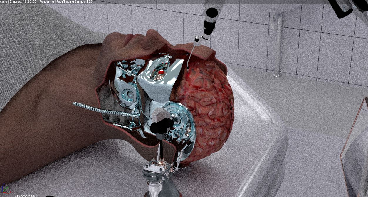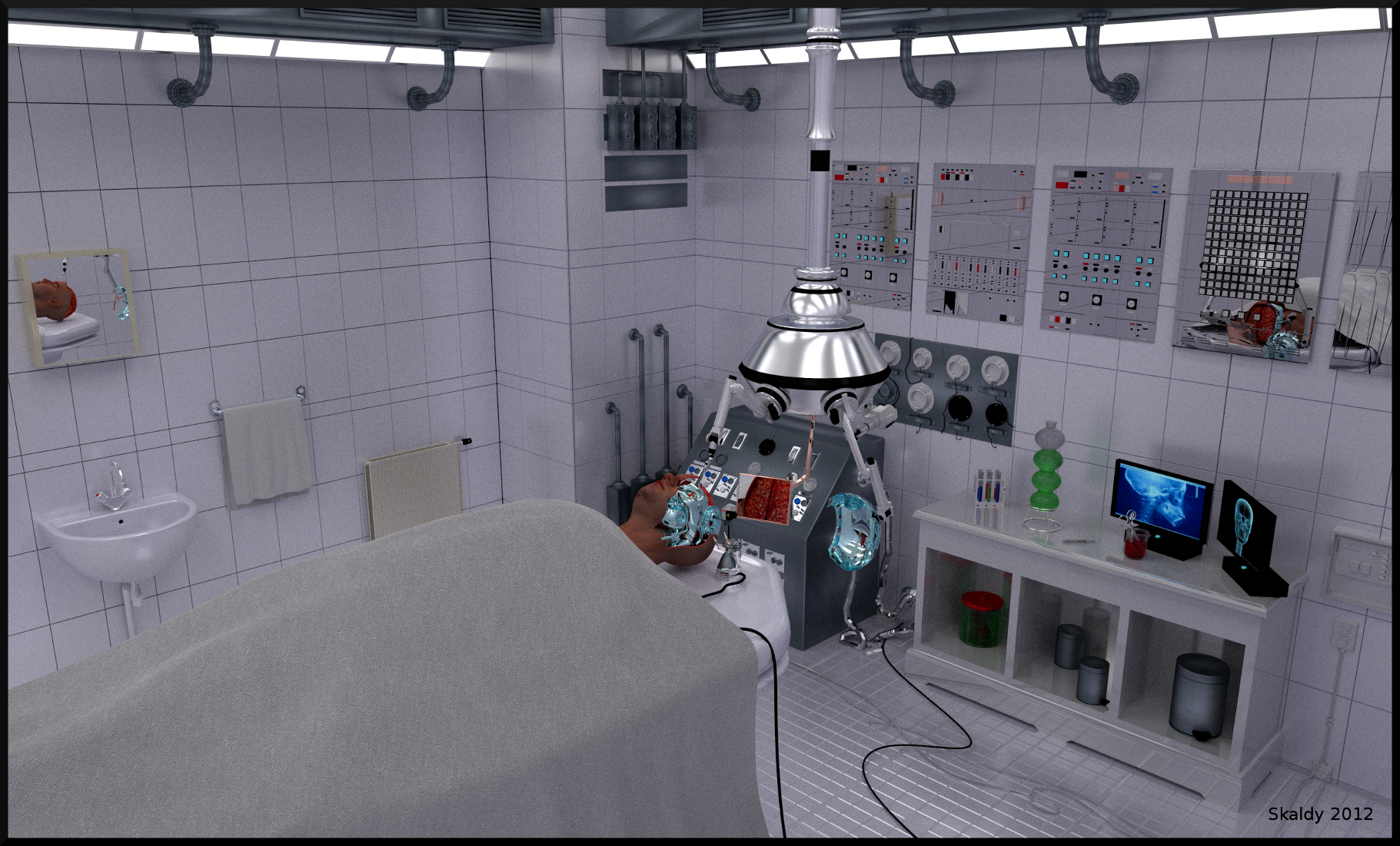 Gracias. Un día entero de curro, rigging de las manos robot, remodelación de los objetos y eso que creo que la mayoría de objetos que aparecen en la escena no son míos, luces, materiales, render de varias horas, pero bueno como la escena me gustaba se hizo a gusto. Si quería poner muchos tonos de blanco, las paredes azulejo blanco y el suelo reflejan bastante para darle ese aire a hospital clinico, otra cosa que lo haya conseguido, claro.