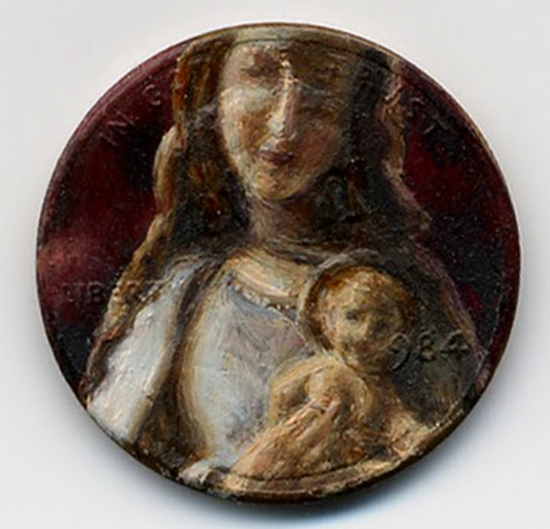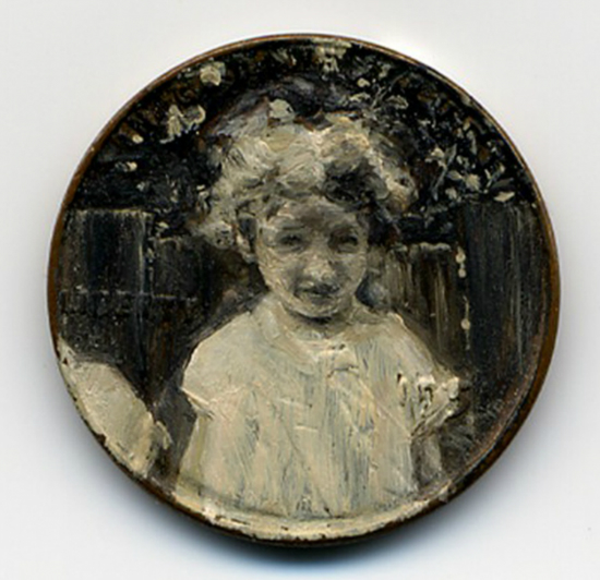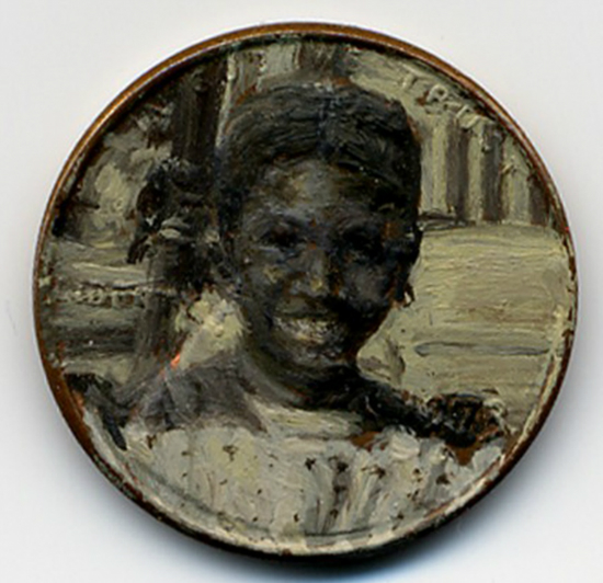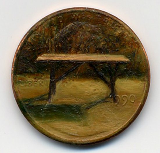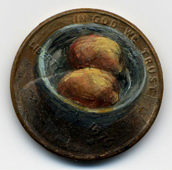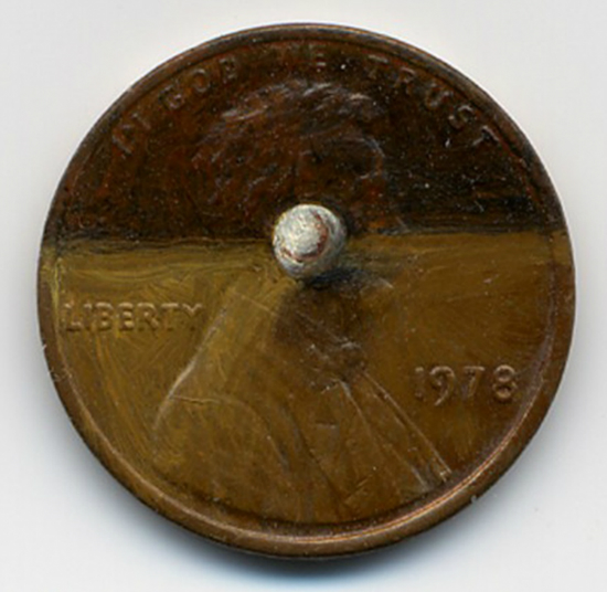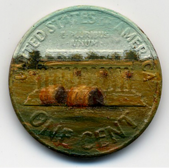 He visto pintar y dibujar en sitios raros, pero este se lleva la palma, sobre todo porque no es garabatear unas monedas, si no, dedicarle arte, esta pintora utiliza las monedas como lienzo, la artista se llama jacqueline lou skaggs.