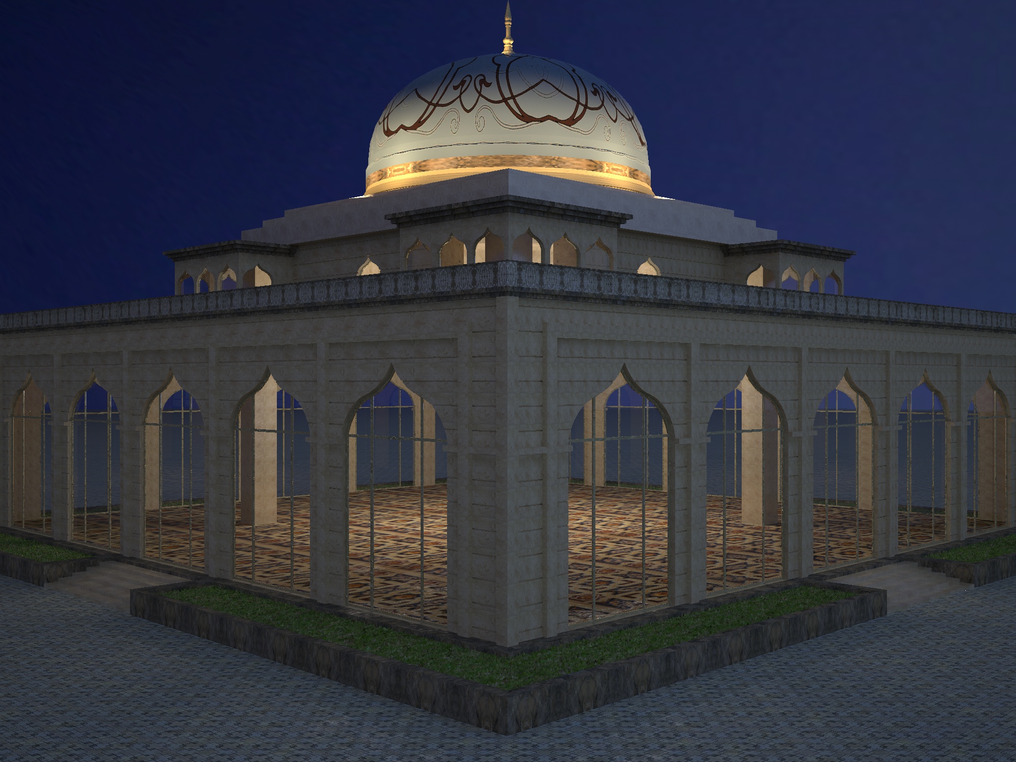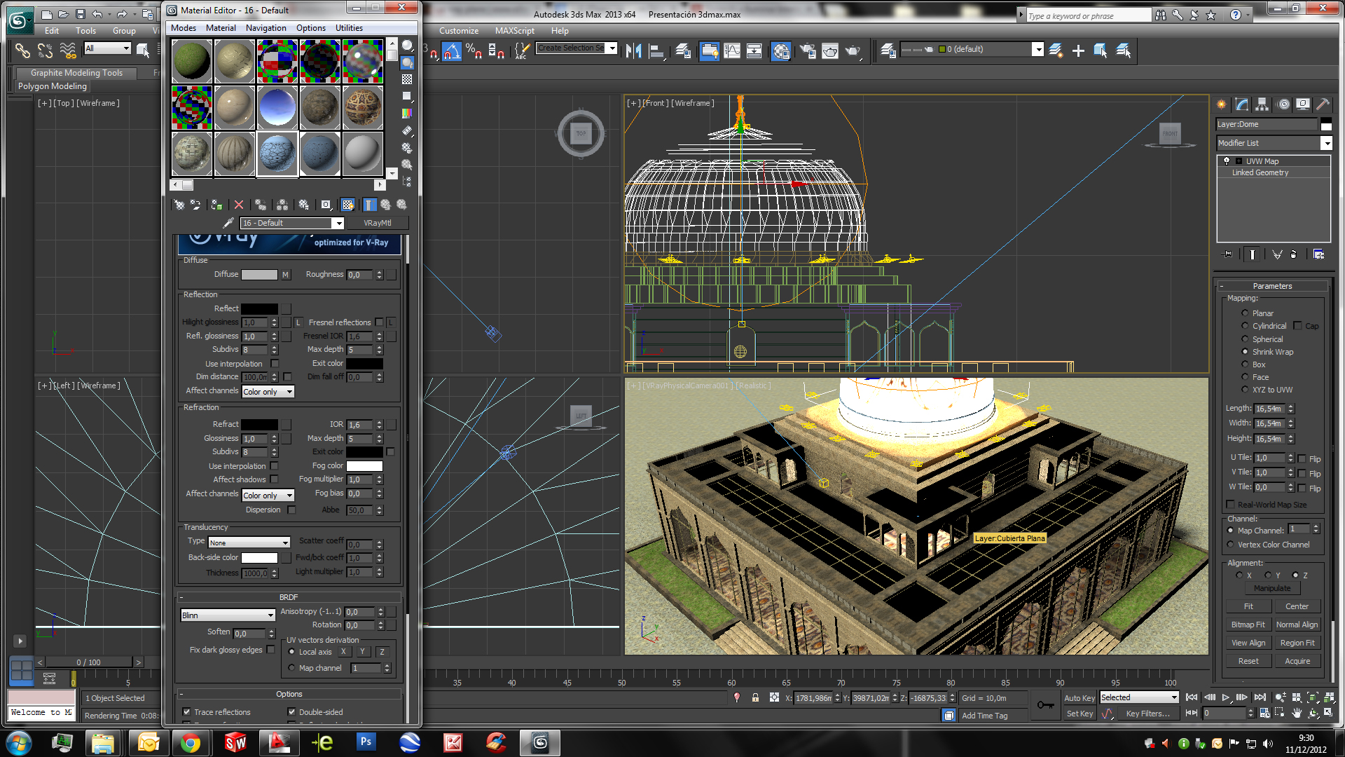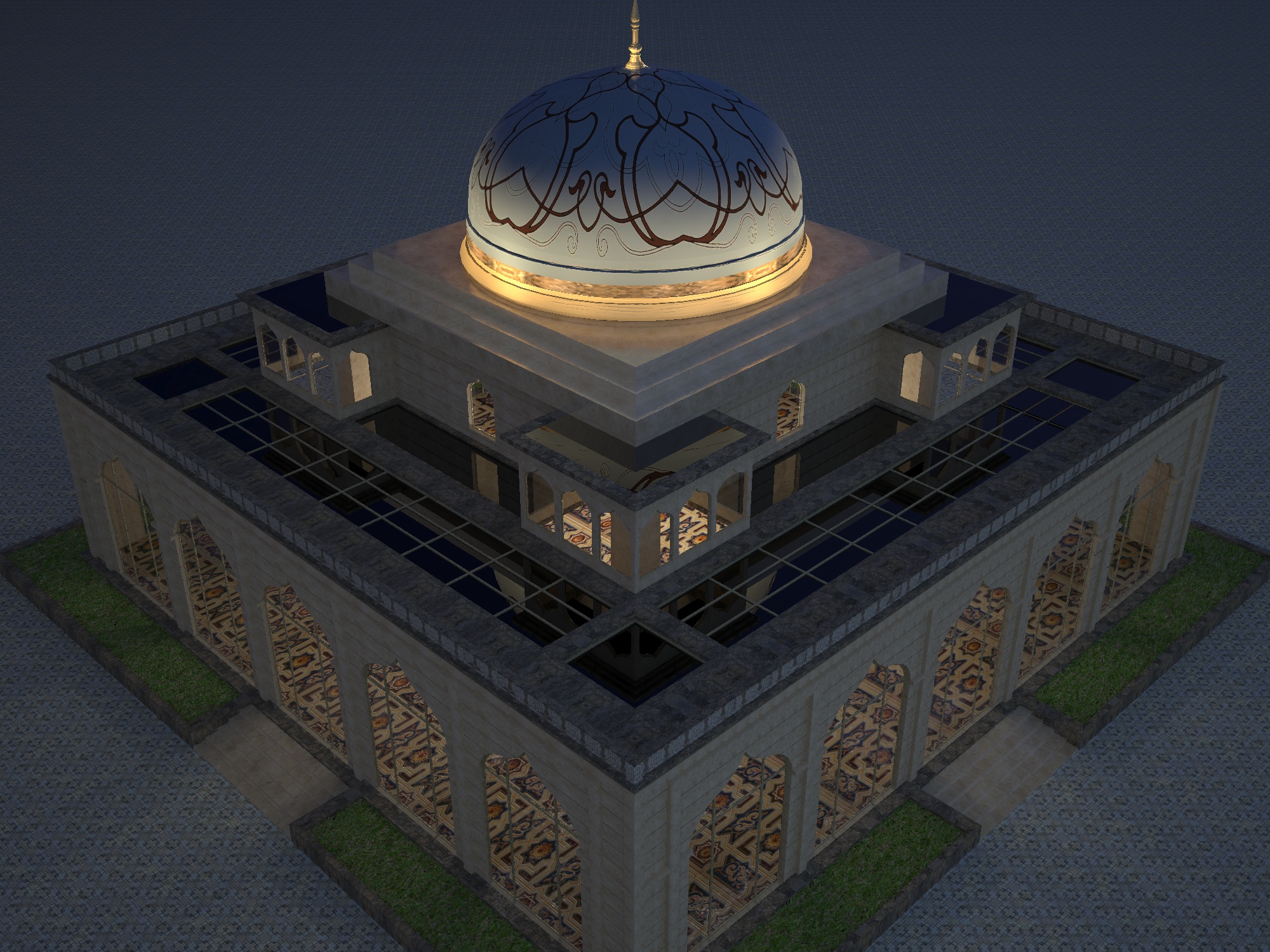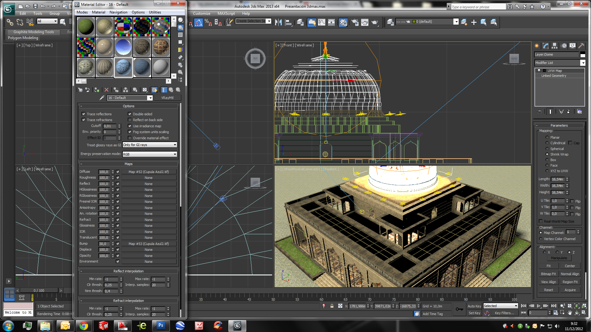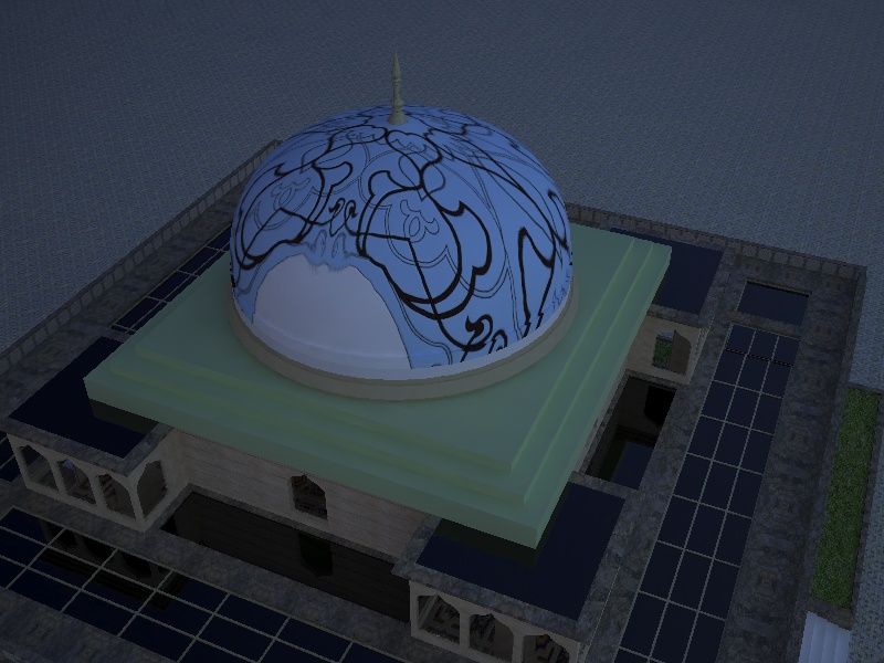 Behemod, hay una cosa que no he podido conseguir y ha sido que la cúpula con la textura aplicada fuera semi transparente o translúcida para que cuando exteriormente no esté iluminada, la luz interior del edificio la ilumine. Adjunto dos pantallazos para que veas como tengo los parámetros de la cúpula.