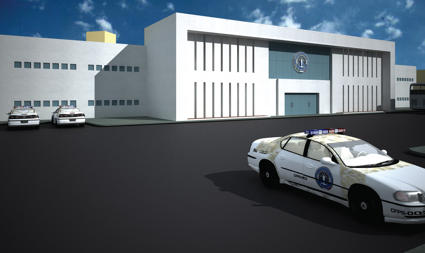 1. Analizar bien los bloques que inserté. Por ejemplo, la patrulla imapala que descargué de internet, traía un error. El interior del tablero se encimaba con la malla del auto, por eso se ven dos colores (arena y blanco). Solución, tome todo el interior y lo moví hacia abajo dos centímetros. Consejo: antes de insertar un bloque hay que renderizarlo con el motor de nuestra preferencia para asegurarnos que está bien y no tiene errores.