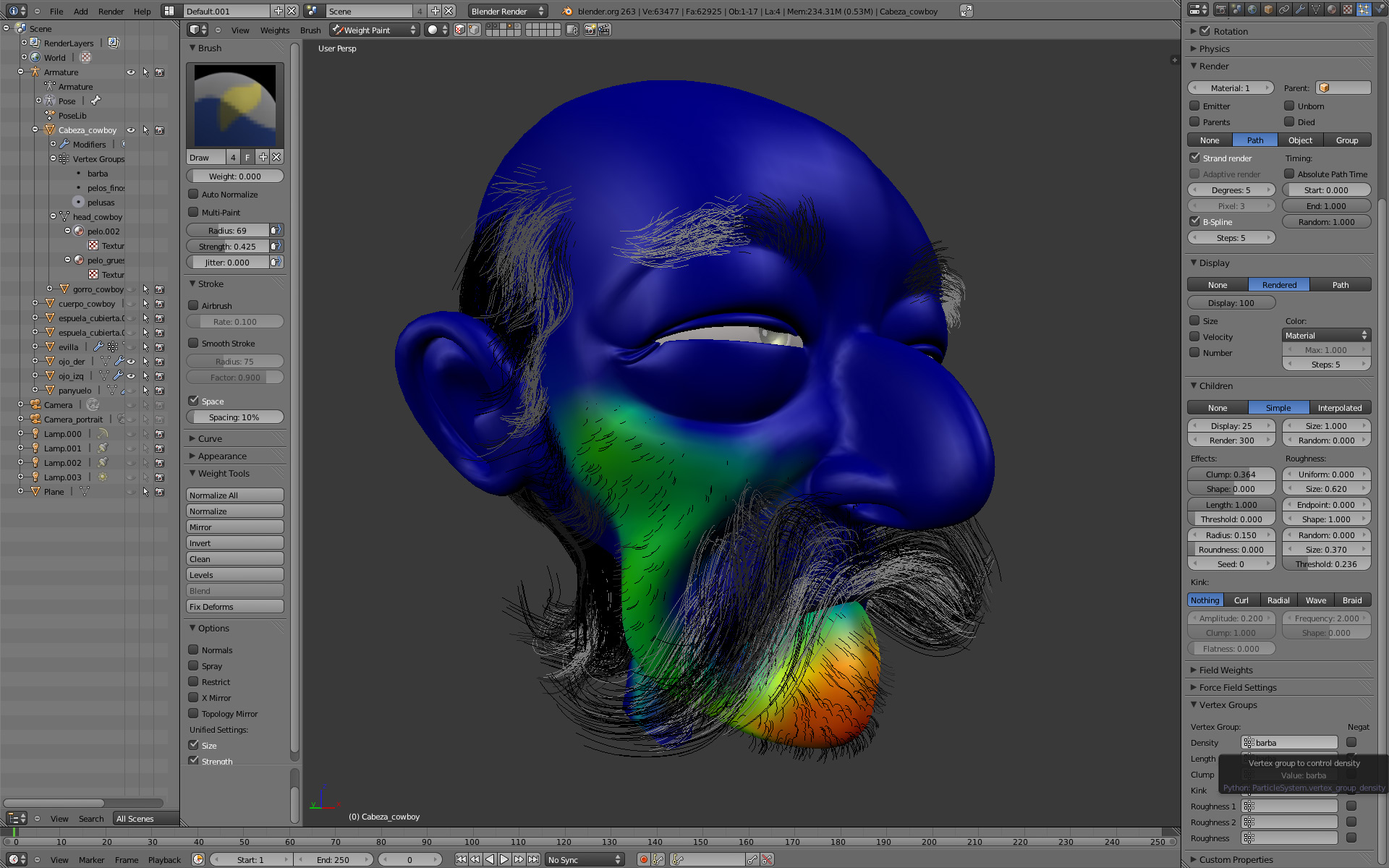 He usado como 3 bloques para crear el pelo, 1 para el pelo general y largo, 2º otro para el pelo corto facial y límites del pelo general y finalmente un tercero para el bigote.