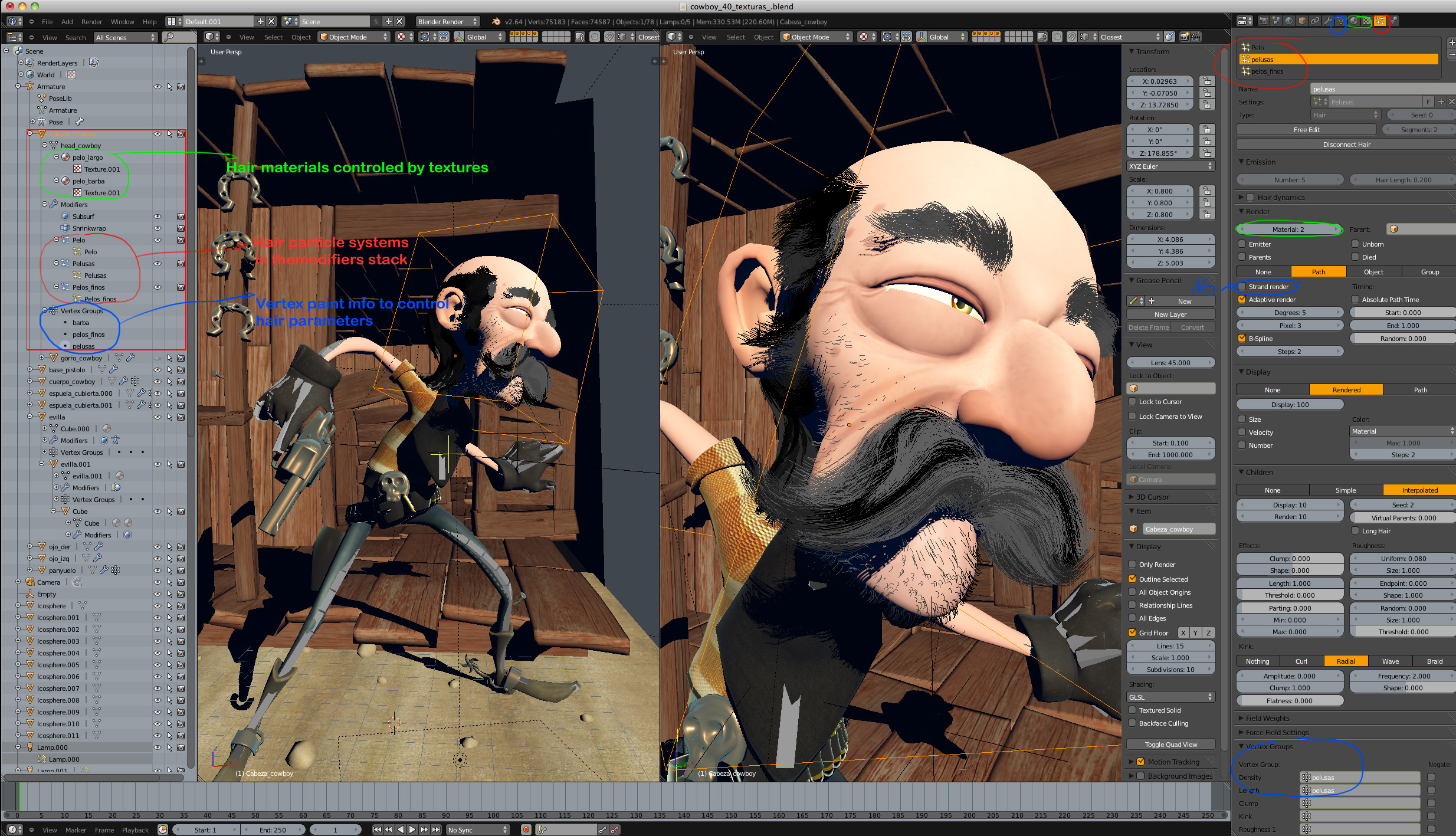Sí, con el sistema de pelo que trae el propio programa. El pelo siempre es un poco complicado y tedioso, porque has de seguir paso a paso un proceso en el que si varias lo más mínimo puede quedar totalmente distinto. También has de hacer muchas pruebas de render ya que el feedbak tienes por pantalla no es el look final real.