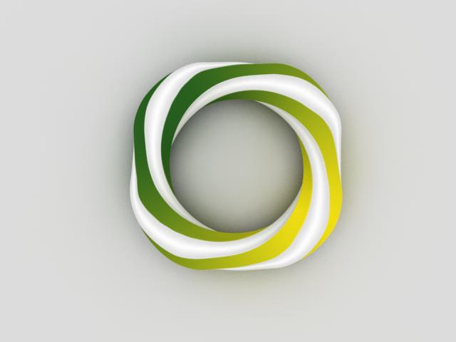 Primero se crea una Spline con la sección del logotipo yo he usado un Ngon de 8 lados y luego con editspline se tocan los manejadores de los vértices para dar a los lados cierta curvatura hacia dentro (como parece en la imagen del logotipo en 2d), luego se aplica un modificador de extrusión con muchos pasos y se desmarcan las opciones de Cap start y Cap end (para que no nos ponga las tapas a la extrusión, luego se mapea la extrusión con un mapeado cilíndrico con uvwmap para darle los colores deseados y creamos una textura con los colores en vertical.