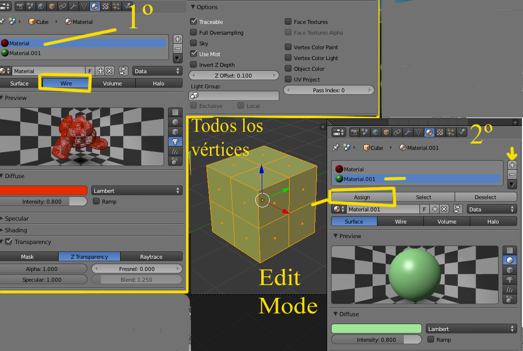 Si lo quieres hacer a mano, primero creas un material de tipo wire con transparency activada y el valor de z offset un poco subido, luego creas otro material, seleccione todos los vértices y presionas asign.