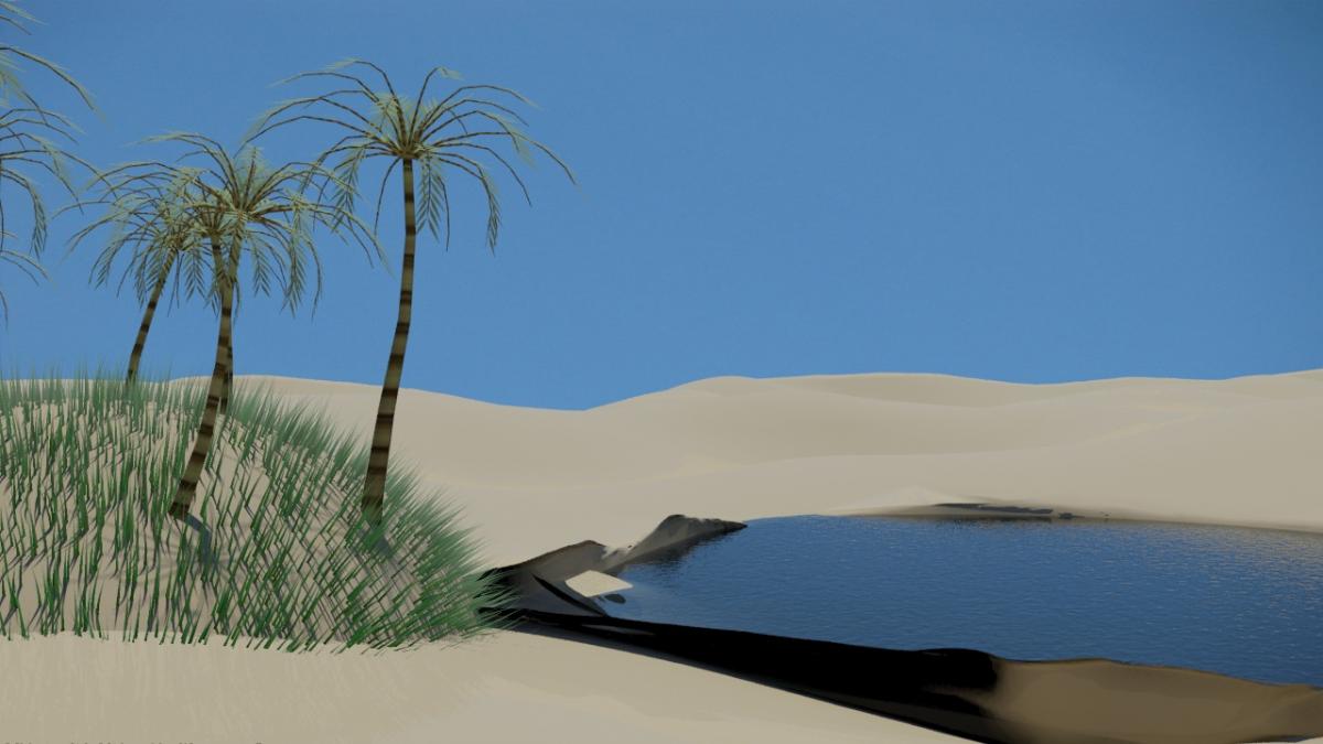 Hola, mientras Wanyaes nos envía sus consejos, podrías buscar modelos de palmeras y hierbas para insertar en tu escena. También puedes insertar una luz y activarle las sombras, eso ya te dará un efecto de mucho calor, según la intensidad. ¿modelaste en AutoCAD? Lo pregunto porque la orilla del ojo de agua se ve facetado. Estaré al tanto para ver cómo mejoramos la escena, es más, podrías subir tu archivo para que hiciéramos pruebas y las publicaramos aquí en el foro y compartir los tips. Saludos.