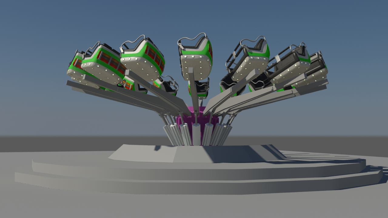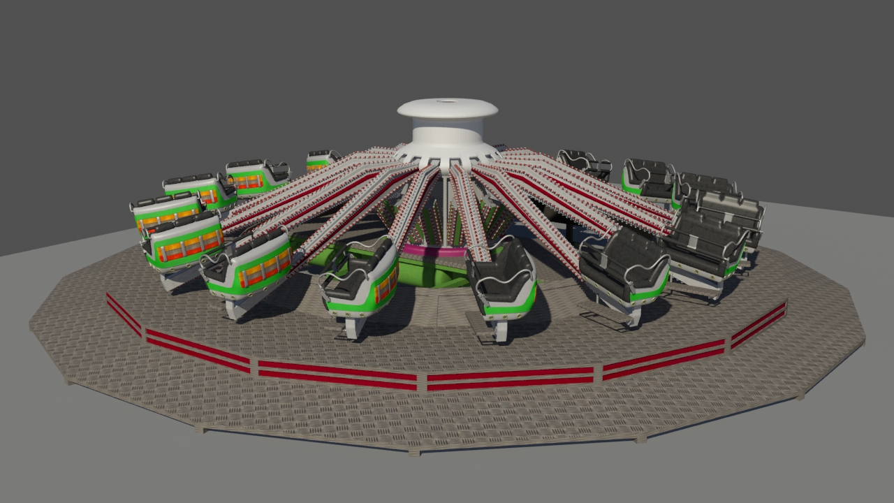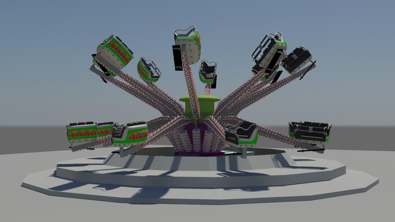 Muchas gracias por comentar, tomare apunte. Sobre la situación de la atracción, la atracción tiene una plataforma de un camión porque en principio iba a hacerla en una feria, pero decidí cambiar eso, por la cantidad de modelado que tendría qué darme para hacer un escenario decente. Entonces se me ocurrió la idea de tematizarla, por norma general las atracciones siempre están en remolques, menos las exclusivas o fabricadas para parques de atracciones, entonces tampoco estaría mal del todo, ya qué esta atracción es típica de remolque, pero como te dije fue más por la cosa de que en principio no iba a estar situada ahí.