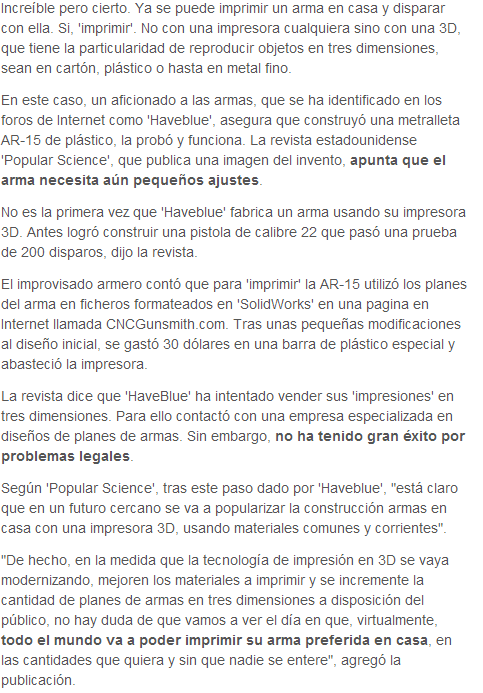 Tengo un enlace por ahí de un tío que se imprimió una pistola calibre 22 y disparaba de verdad.