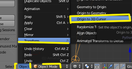 Esto coloca el cursor en el centro de esa selección, luego cambiamos a object mode, y entonces seleccionamos la opción, object > transform > origin todo 3d cursor)colocar el origin en la posición del cursor)