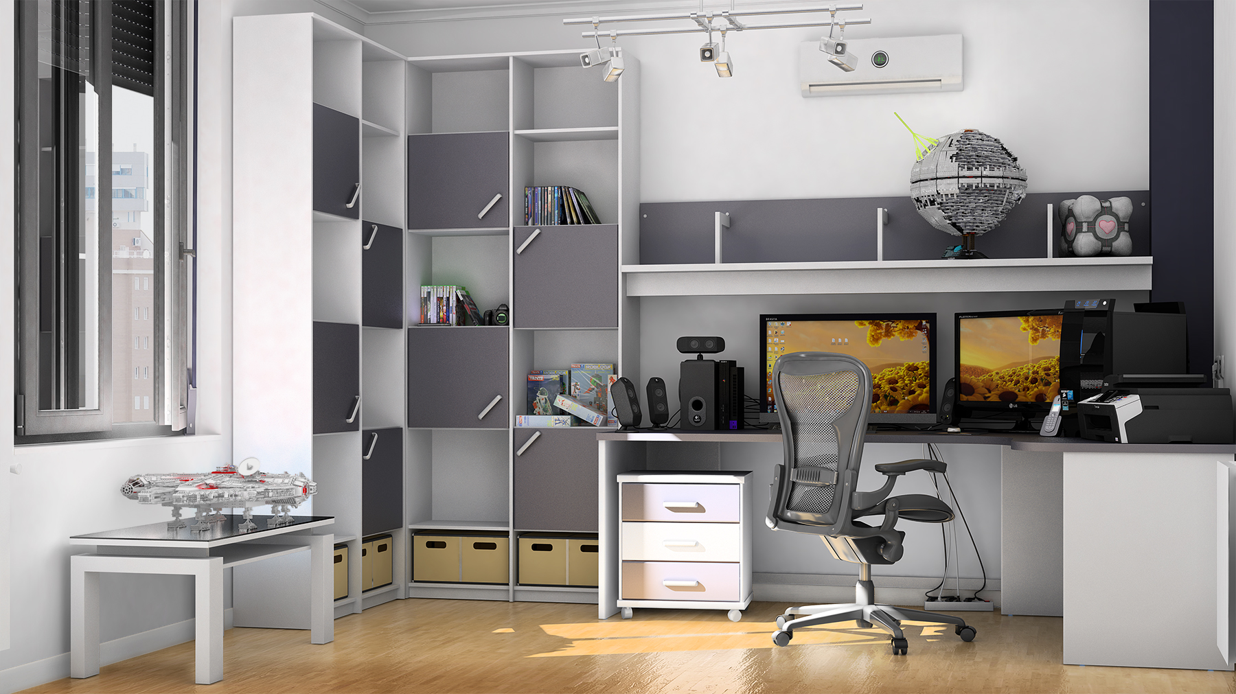 Qué gran trabajo, vaya envidia sana saber hacer estas cosas. Me encanta la habitación-oficina, con el alcón milenario, consola, esa silla, increíble.