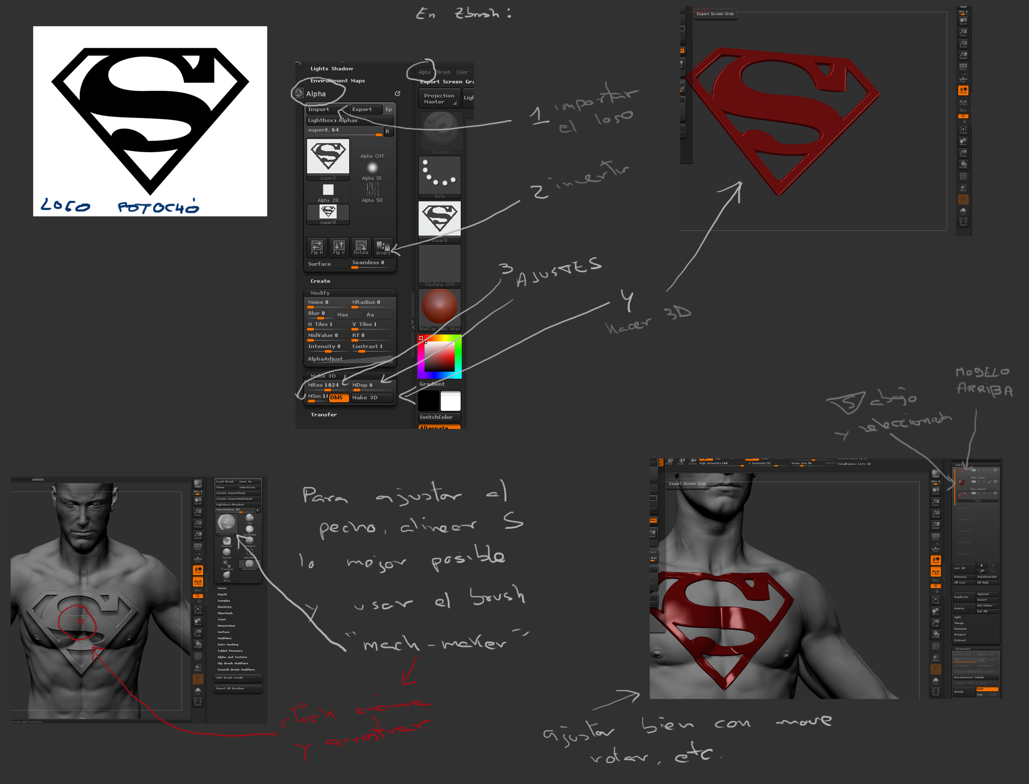 Hola, mi pregunta es de principiantes. Estoy modelando a Superman en ZBrush y lo que necesito es grabarle el logotipo de la s en el pecho desde una imagen que ya tengo. No hablo de textura ni de Bump, simplemente geometría. O sea substraerle un poco para que quede el logotipo grabado, algo, así como usar Substraction en el proboolean de 3ds Max.