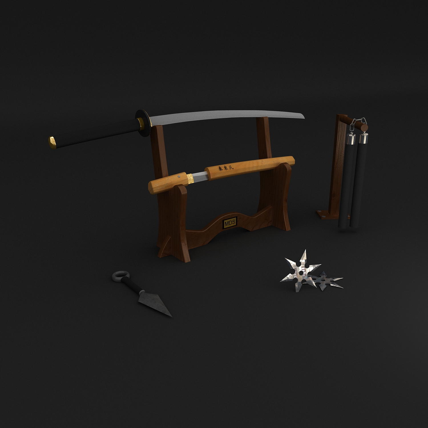 Aquí adjunto 2 vistas. Una renderizada sin ningún material en la katana y otra con la imagen que les dije.
