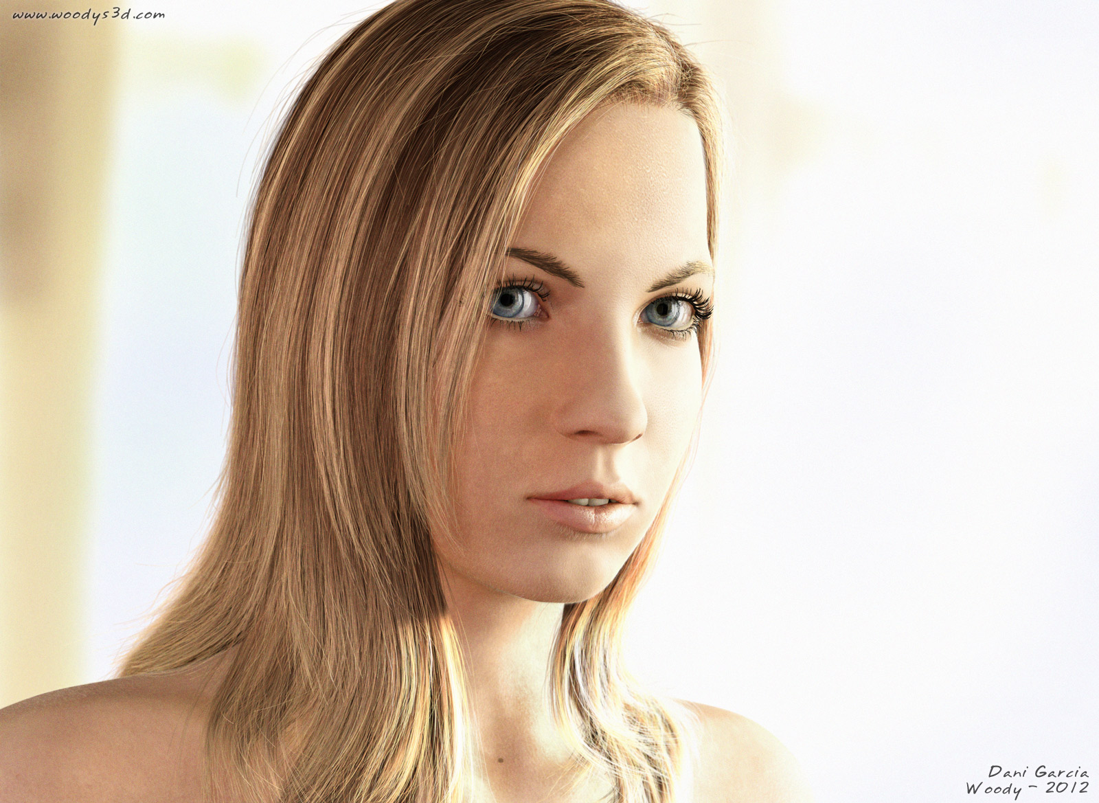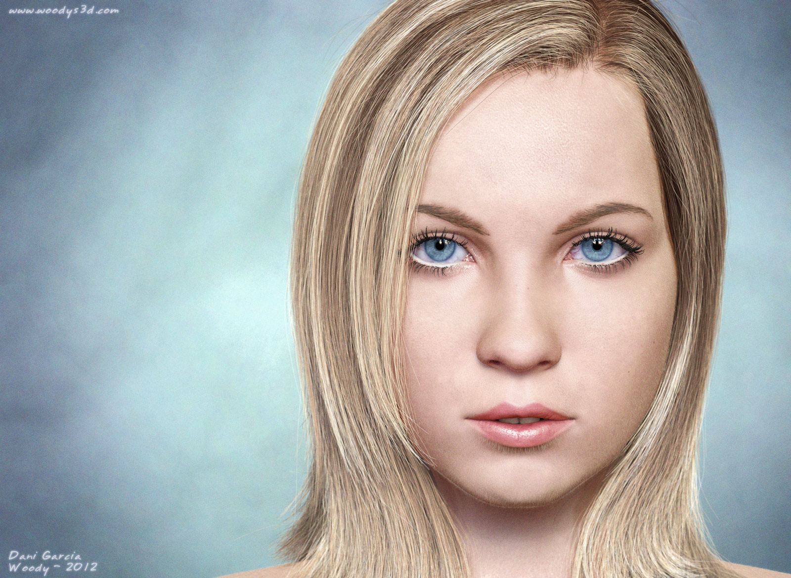 Muy bueno el render, la sombrilla bajo los labios y la sombra de la barbilla muy atenuado, le faltaría brillo al cabello, muy bonitas las pestañas y cejas.