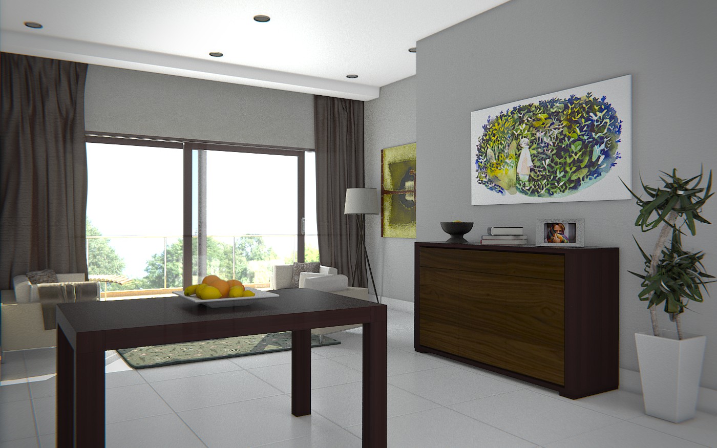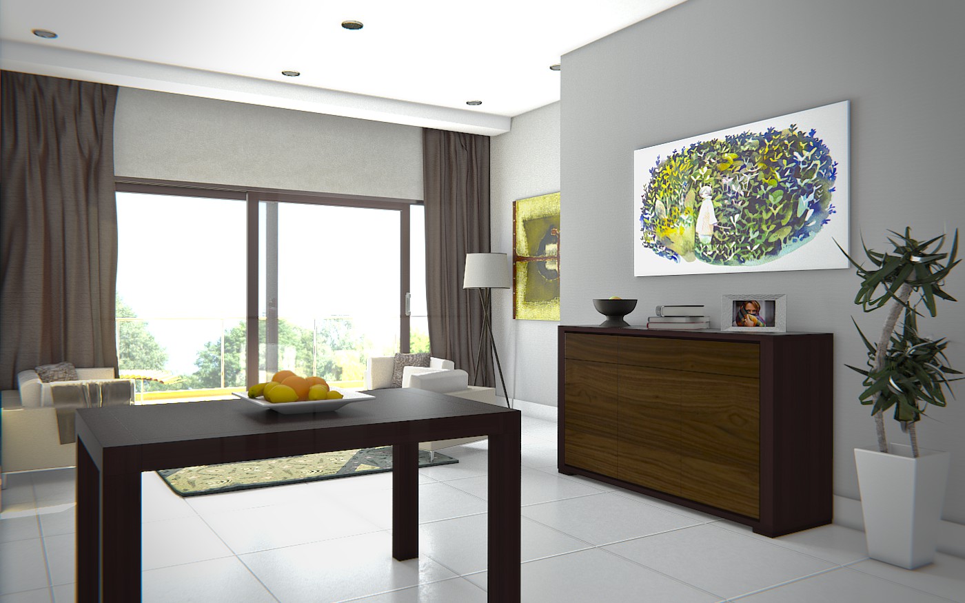 Respecto al punto de vista, creo que tienes razón, he probado la cámara de mil maneras. La idea era que se viera bien el aparador y la mesa, ya que era un trabajo para una fábrica de muebles. Por cierto, la textura del frontal del aparador es así.