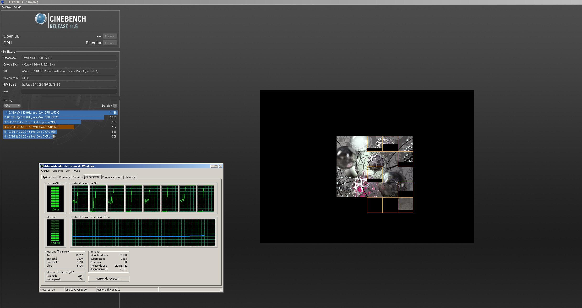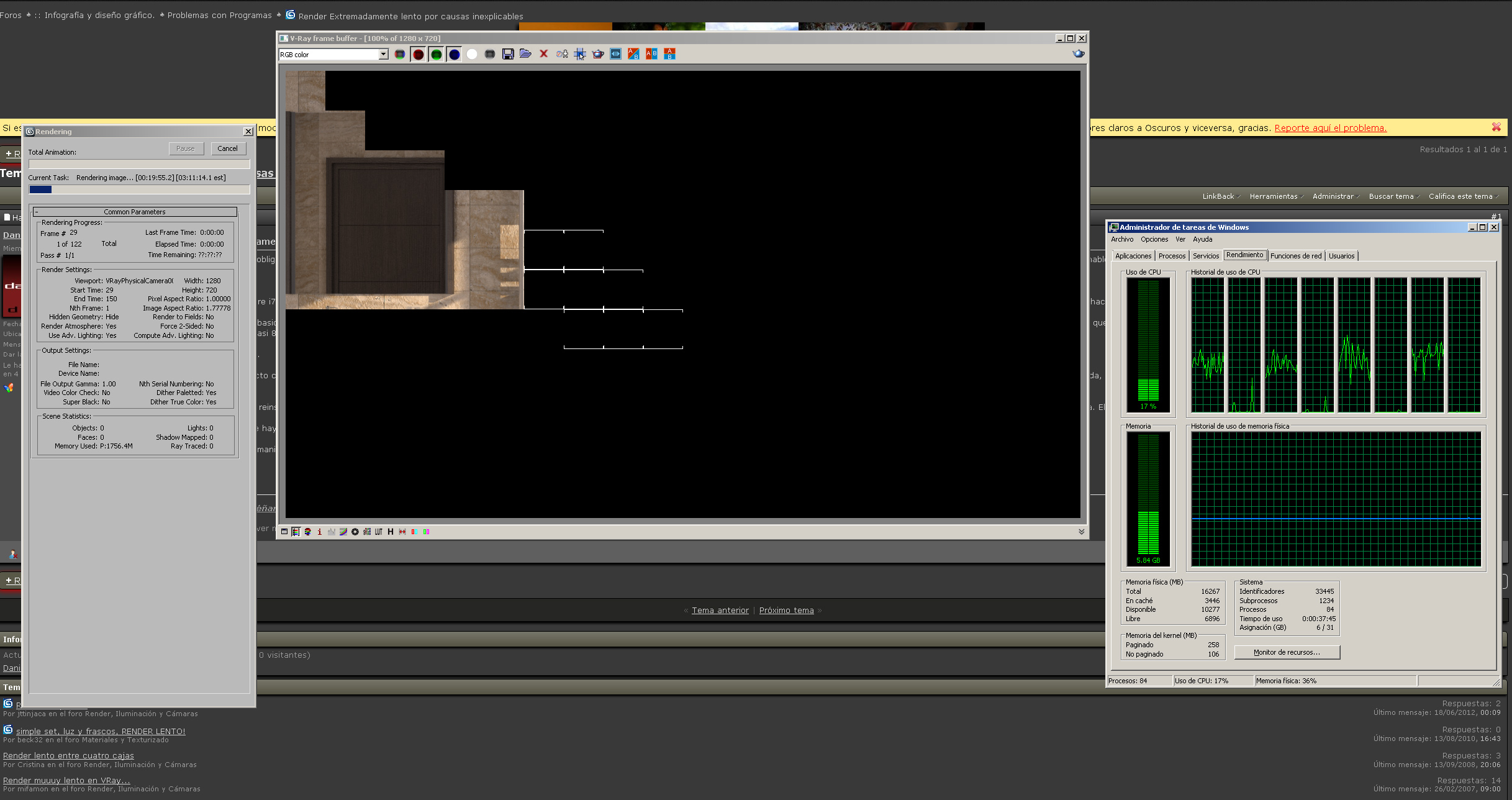 Hablamos de renderizar básicamente. Tanto si renderizo trabajando de manera local una escena mía, como si activo el Backburner server para que empiece a renderizar un trabajo en red, tanto así, como asado, se la escena que sea, uno de estos 2 i7 tarda la vida. Estoy hablando de frames de 5 a 7 minutos de media y éste tarda en hacer 1 casi 8 horas, pero lo hace. Abro el rendimiento en el administrador de tareas y 4 de los 8 núcleos como muertos y los otros 4 a medio gas.