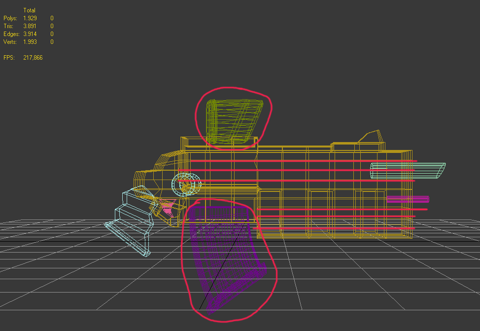 Buenas, a ver para ser un modelo para videojuegos lo veo un poco subido de tris. Te dejo tu imagen en alambre con unas rectificaciones que tendrías que hacer.